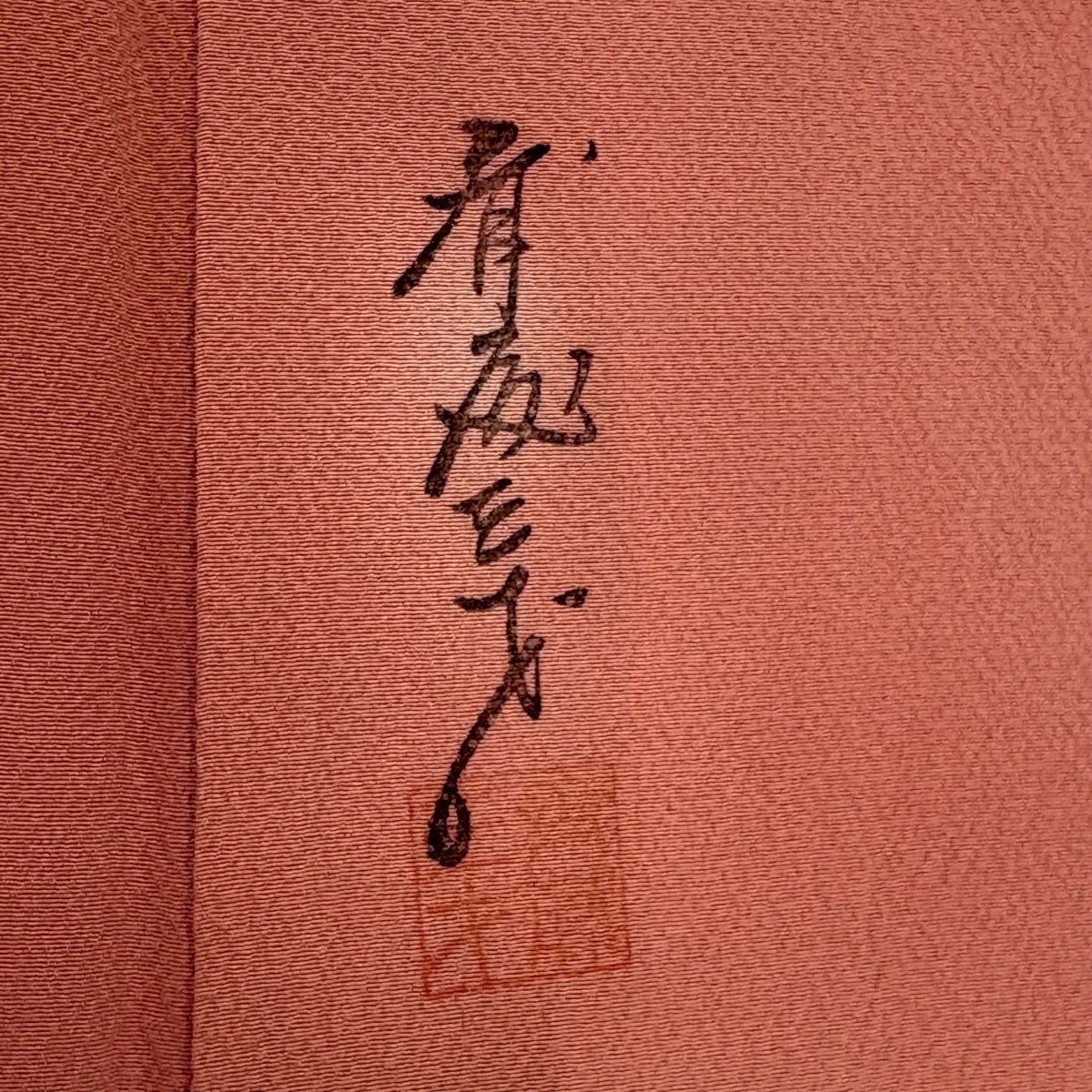 【美品】 付下げ 身丈159.5cm 裄丈62cm S 袷 百貫達雄 落款あり 草花 サーモンピンク 正絹 秀品 一つ紋