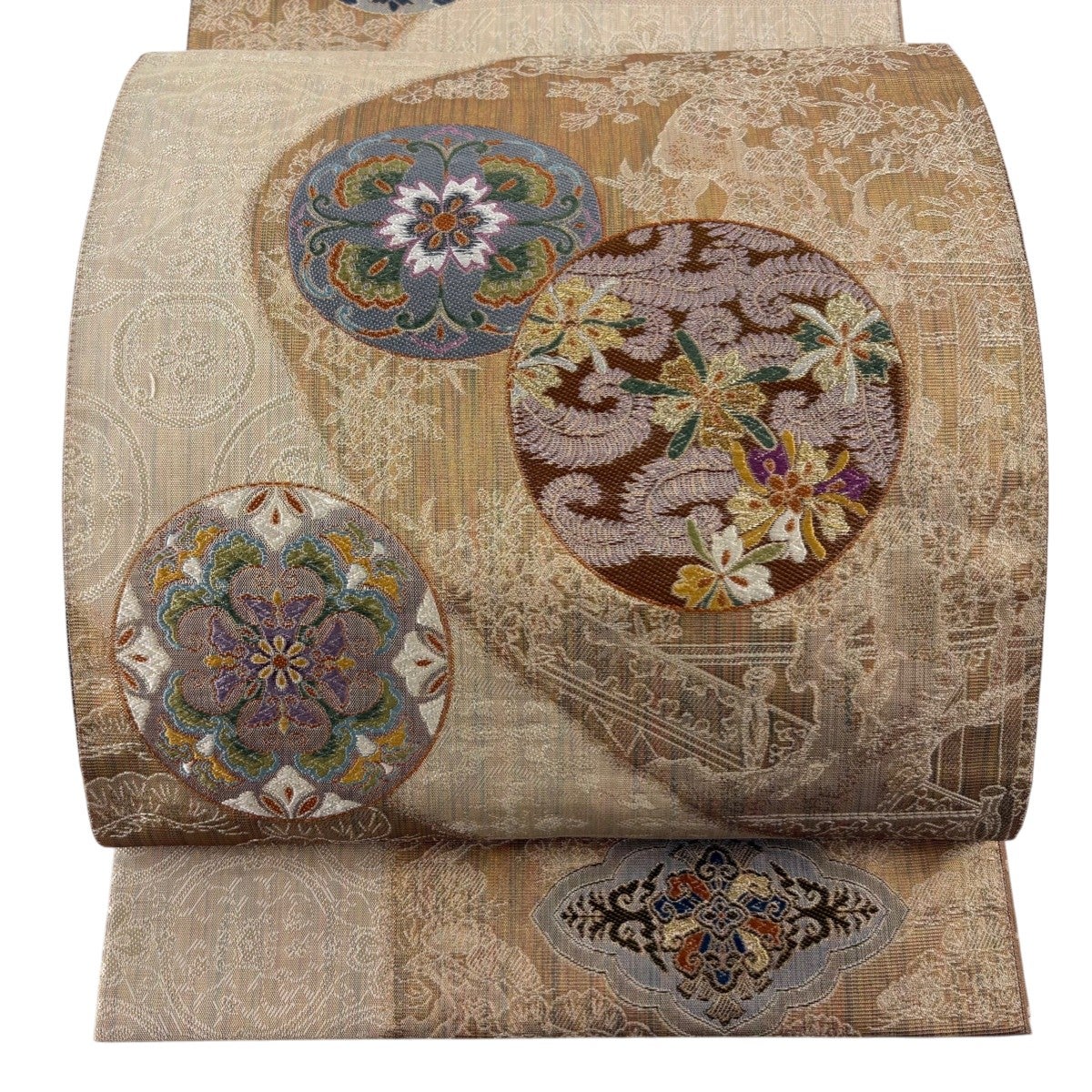 袋帯 秀品 花丸文 枝垂れ桜 金銀糸 箔 ベージュ 全通 正絹