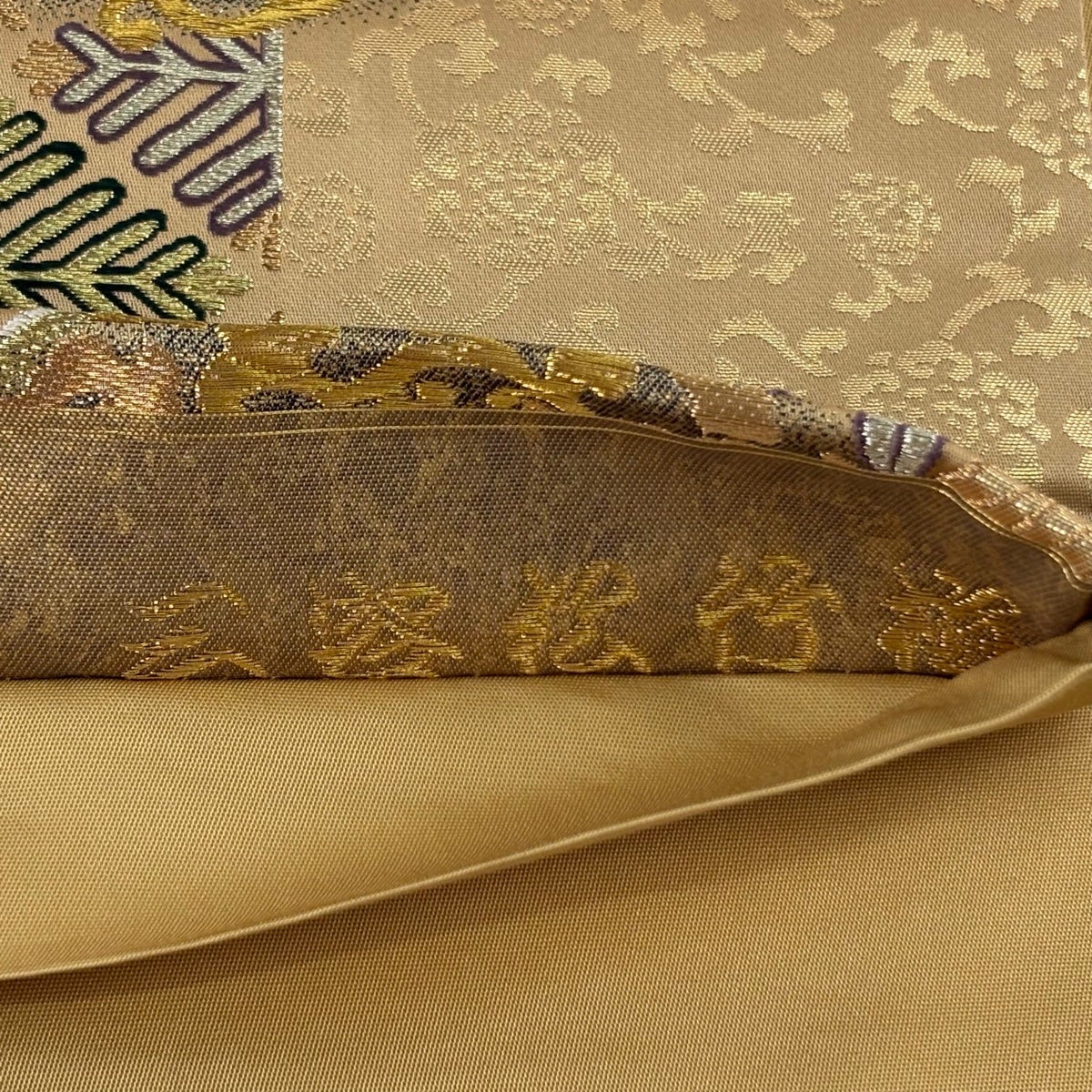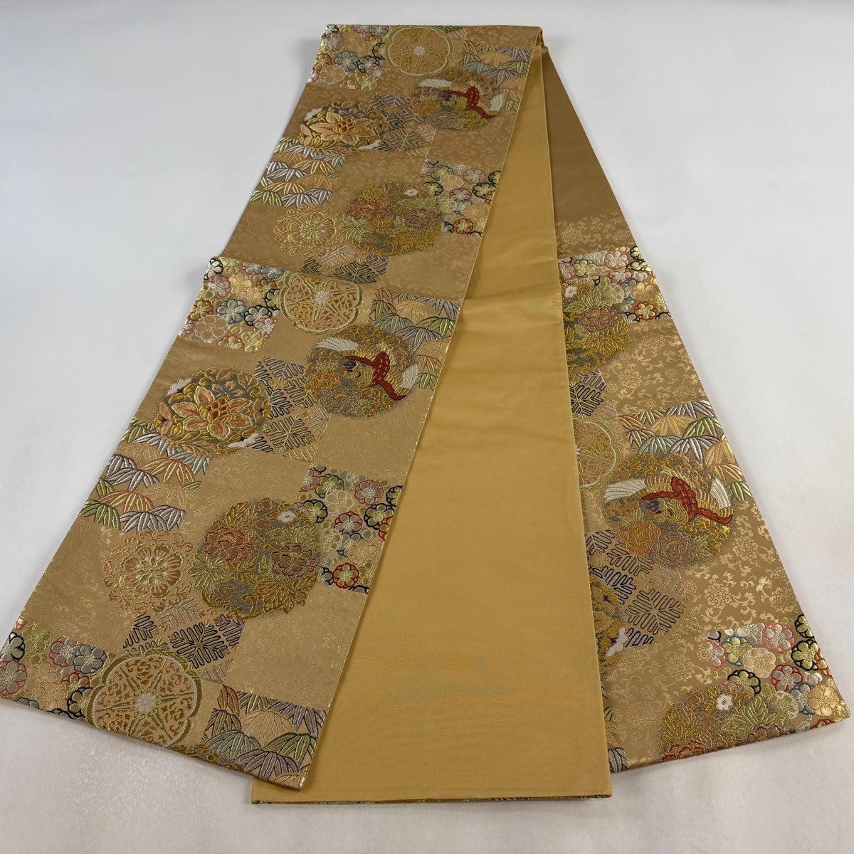 【美品】 袋帯 秀品 鶴 若松 金糸 箔 ベージュ 六通 正絹