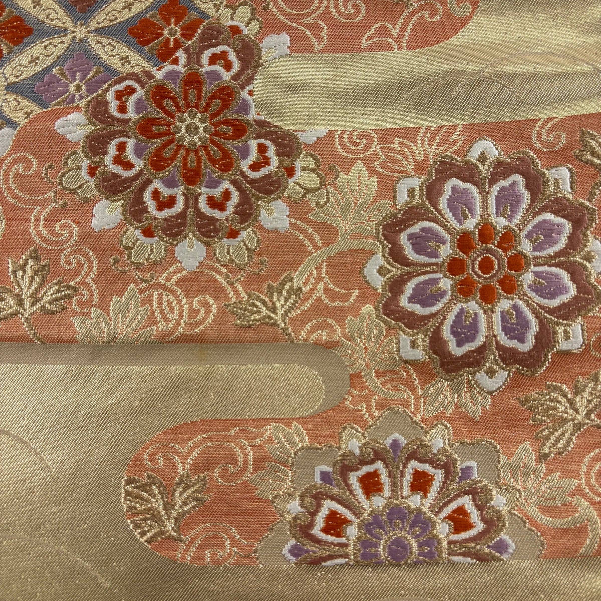 【美品】 袋帯 秀品 雪輪 草花 金糸 箔 ベージュ 六通 正絹
