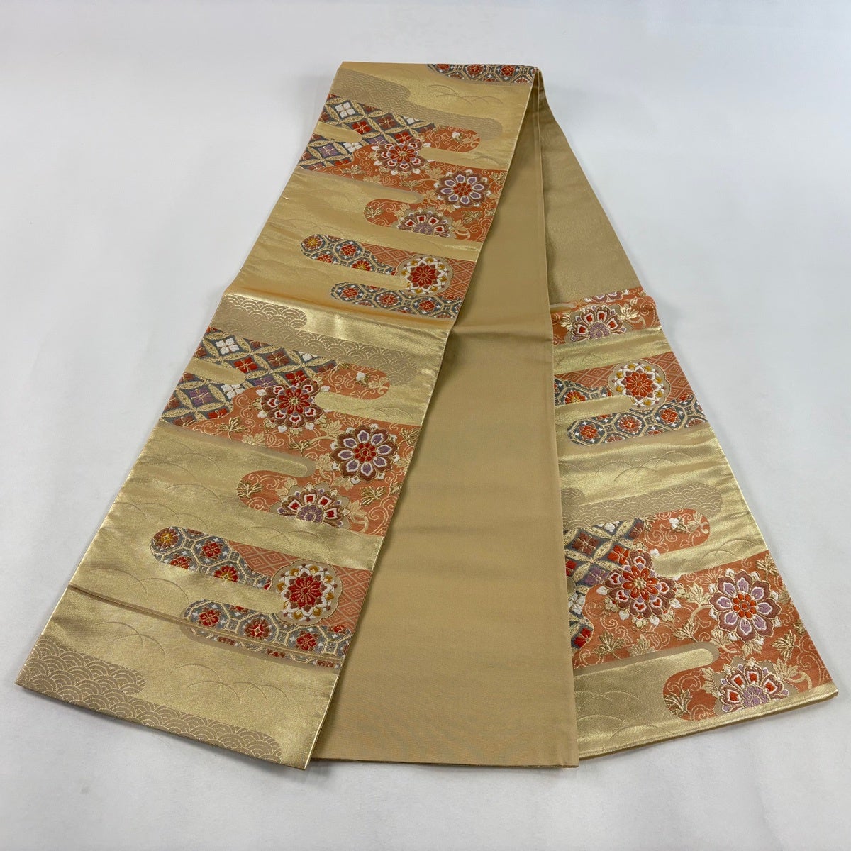【美品】 袋帯 秀品 花筏 立涌 箔 金糸 ベージュ 六通 正絹