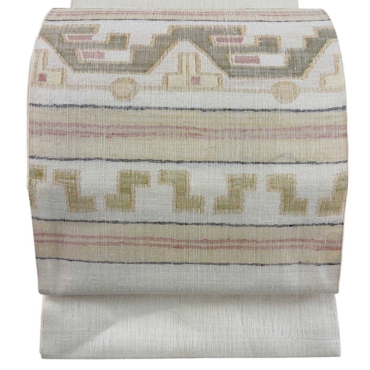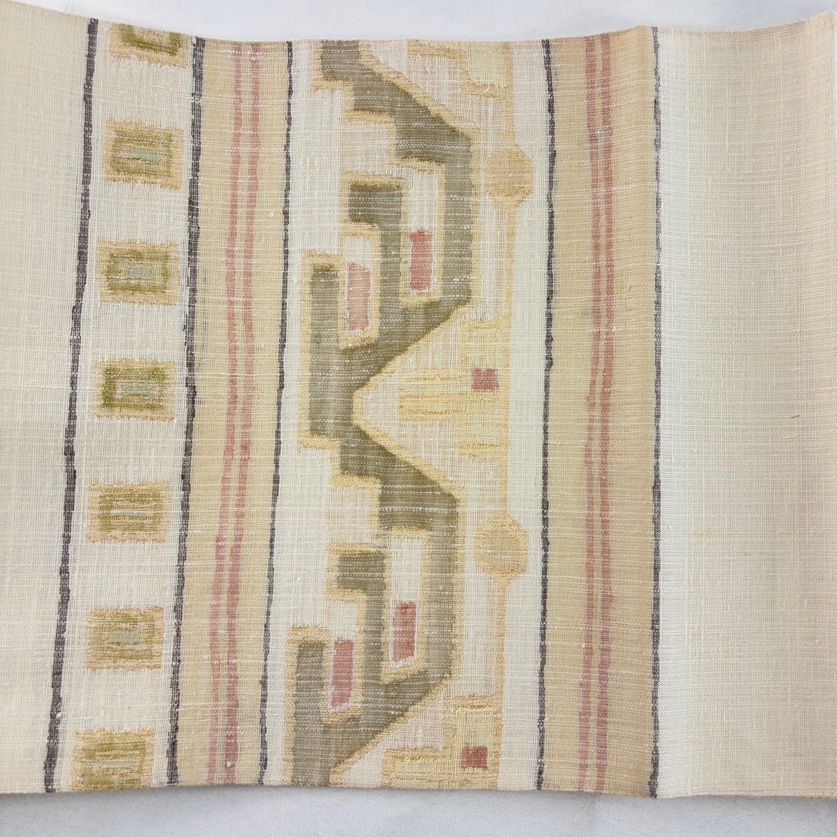 袋帯 秀品 夏帯 幾何学模様 金銀糸 刺繍 ベージュ 六通 正絹