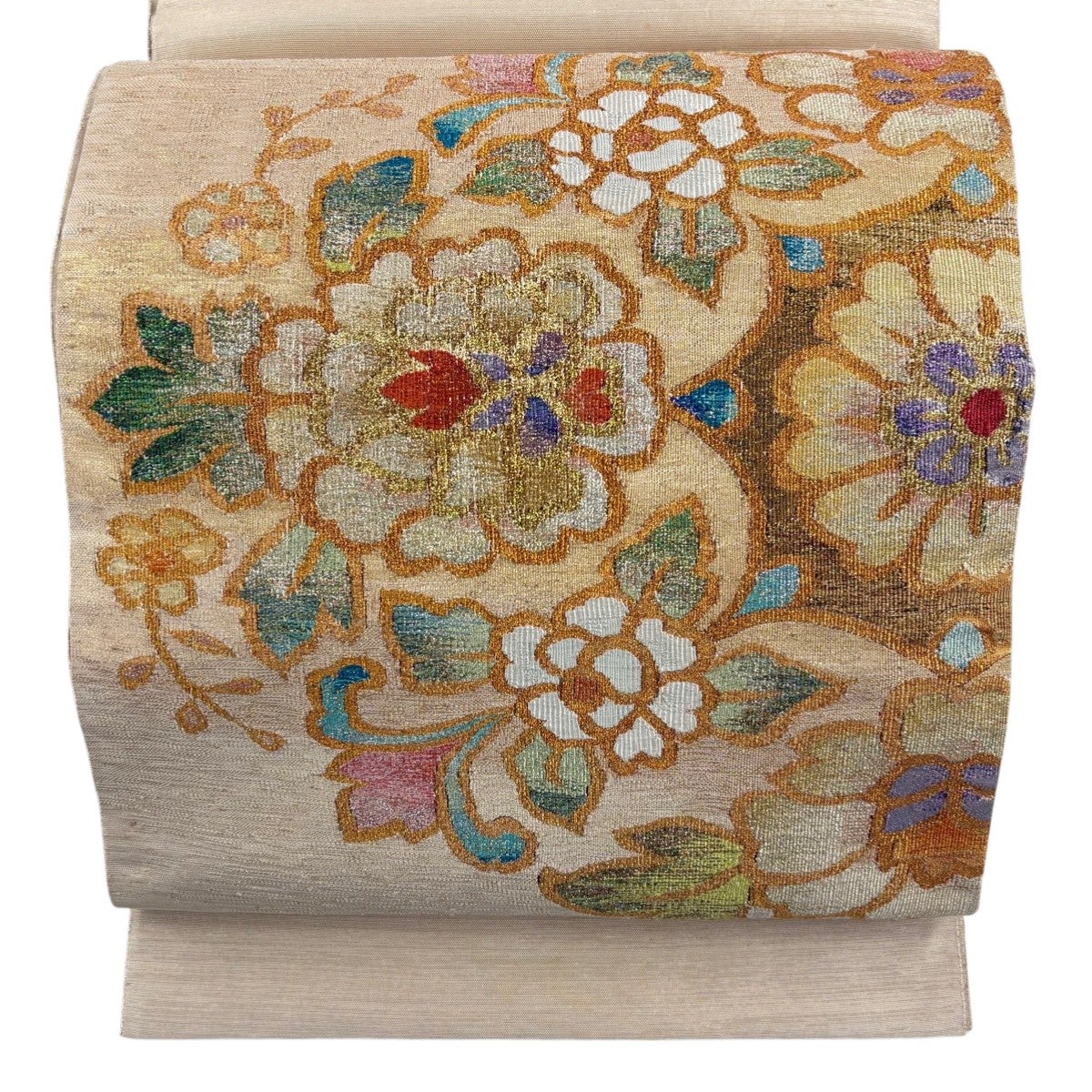 袋帯 秀品 菊 桐 唐織 箔 ベージュ 六通 正絹