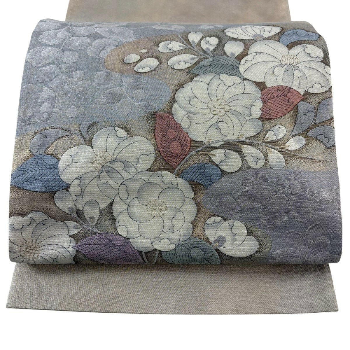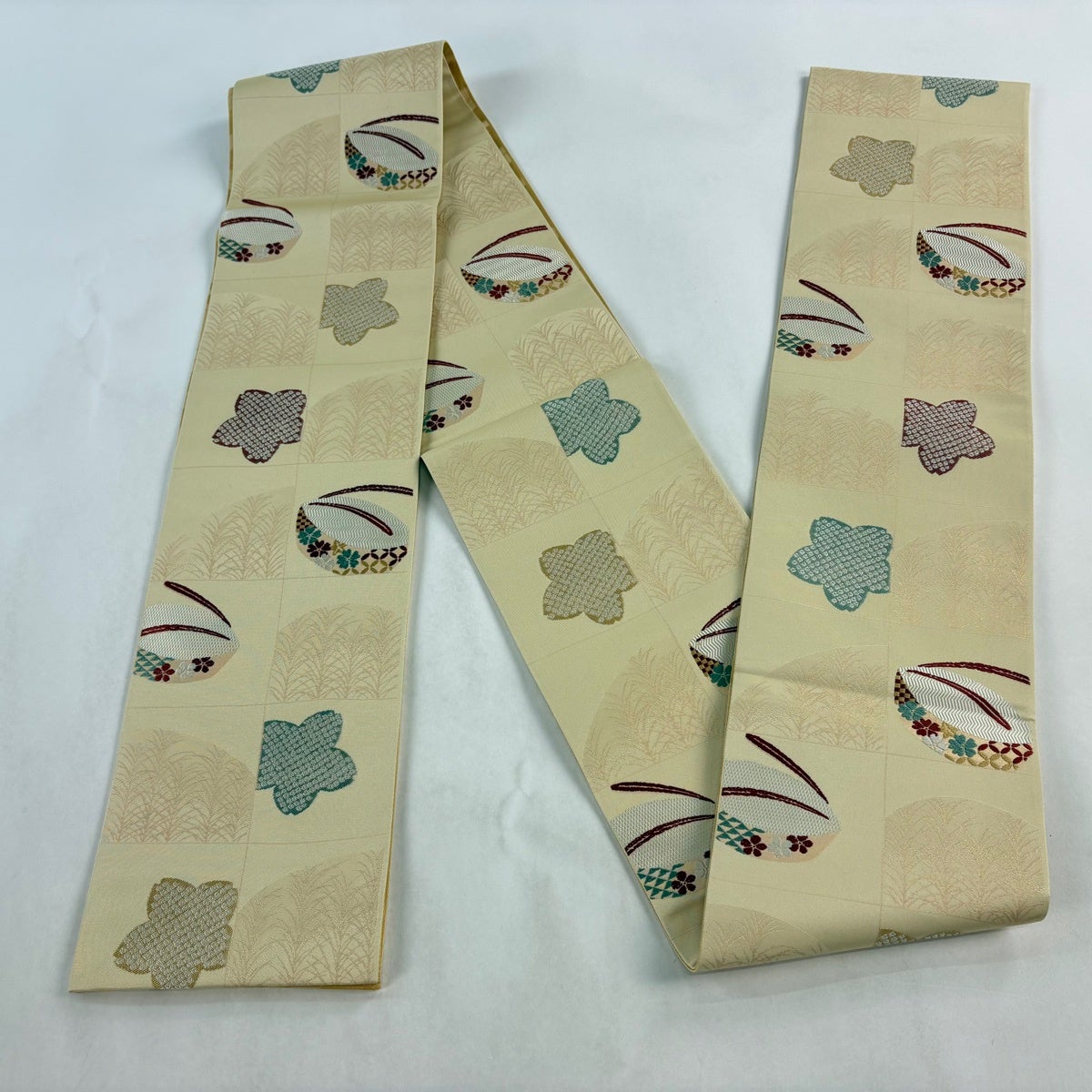 【美品】 開き名古屋帯 優品 菊 楓 ベージュ 正絹