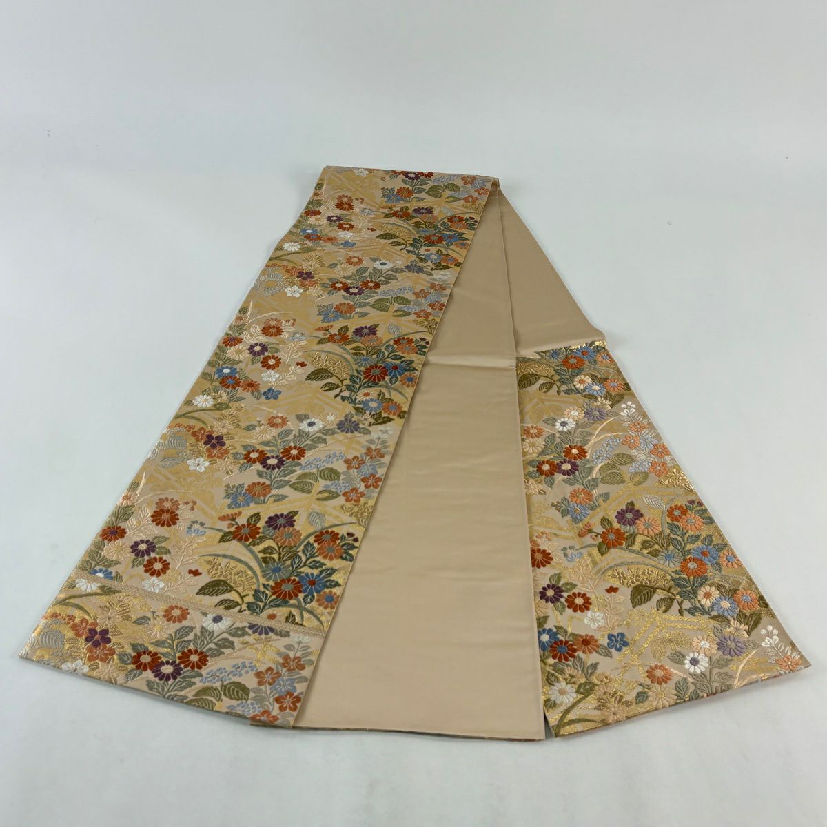 名古屋帯 優品 扇面 菊 金糸 箔 ベージュ 正絹