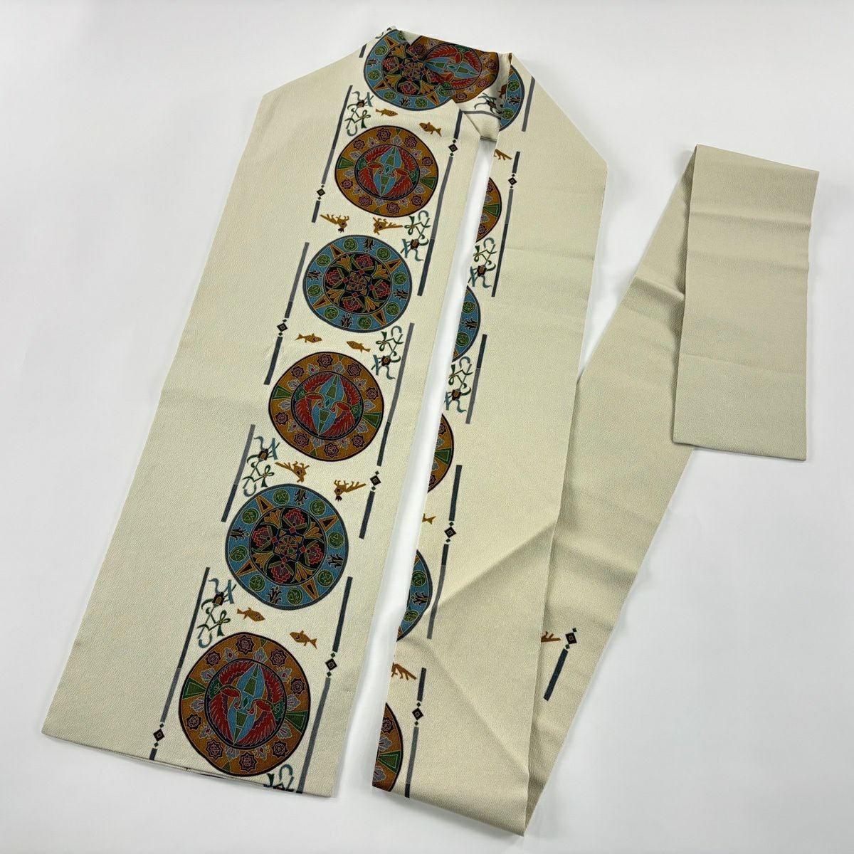 【美品】 名古屋帯 名品 紬地 菊 鶴 ベージュ 正絹