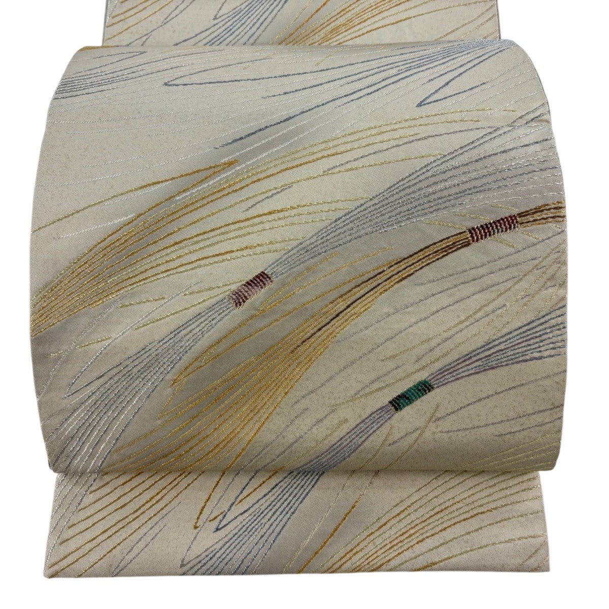 袋帯 秀品 扇 草花 金糸 唐織 ベージュ 六通 正絹