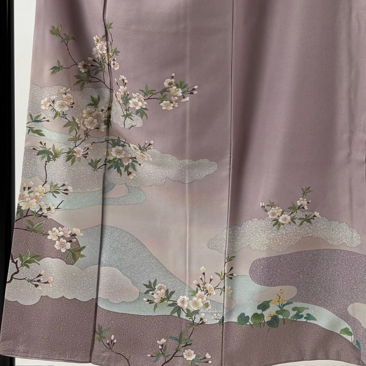 【美品】 色留袖 身丈152.5cm 裄丈62cm S 袷 落款あり 雲文 桜 金彩 ぼかし 灰紫 正絹 優品 一つ紋