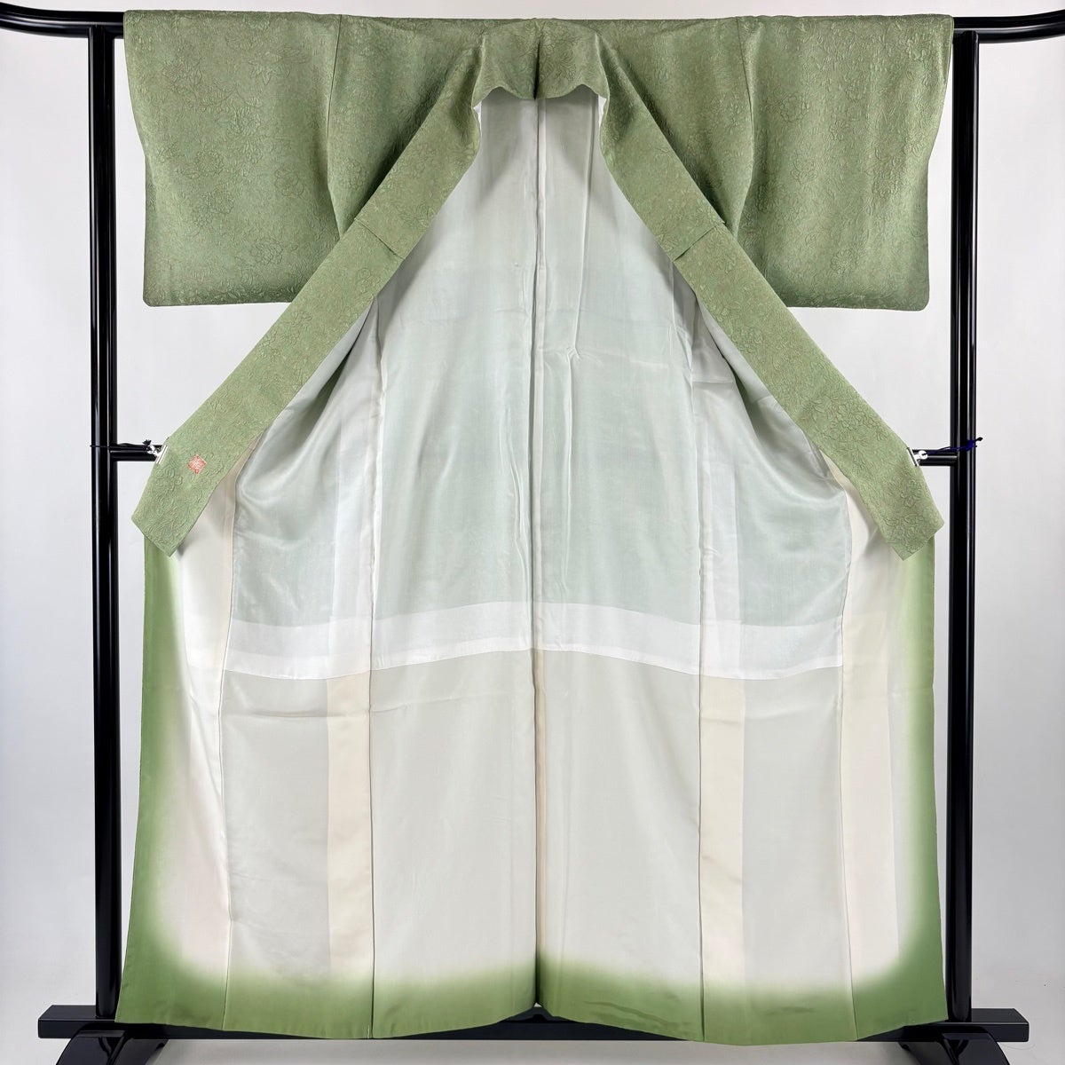 訪問着 身丈162.5cm 裄丈65cm M 袷 花筏 草花 金彩 ぼかし 薄緑 正絹 秀品 一つ紋