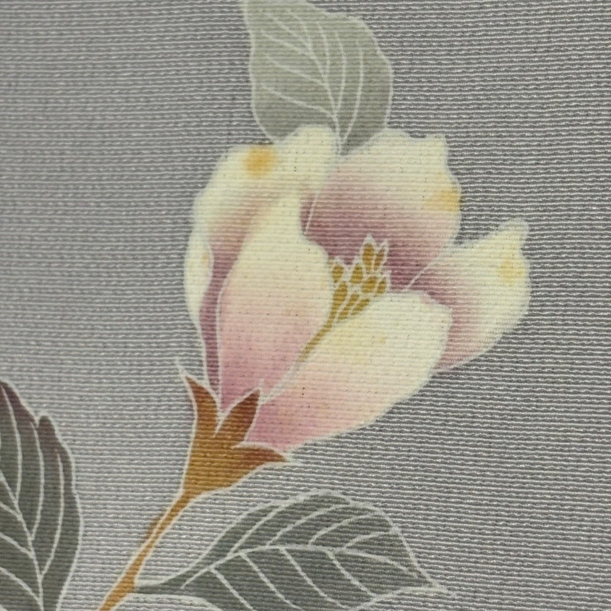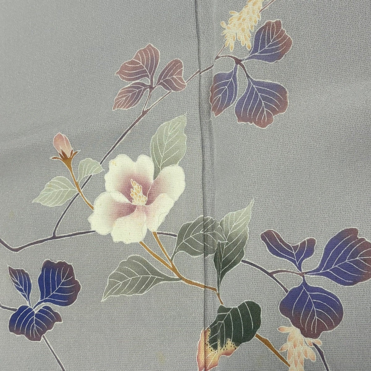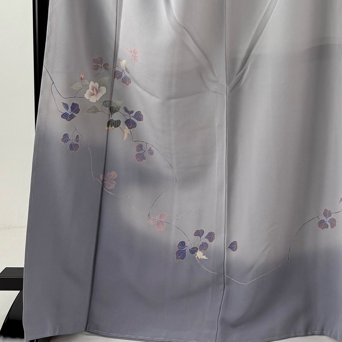 付下げ 身丈164.5cm 裄丈65.5cm M 袷 花器 草花 金糸 刺繍 灰紫 正絹 秀品 一つ紋