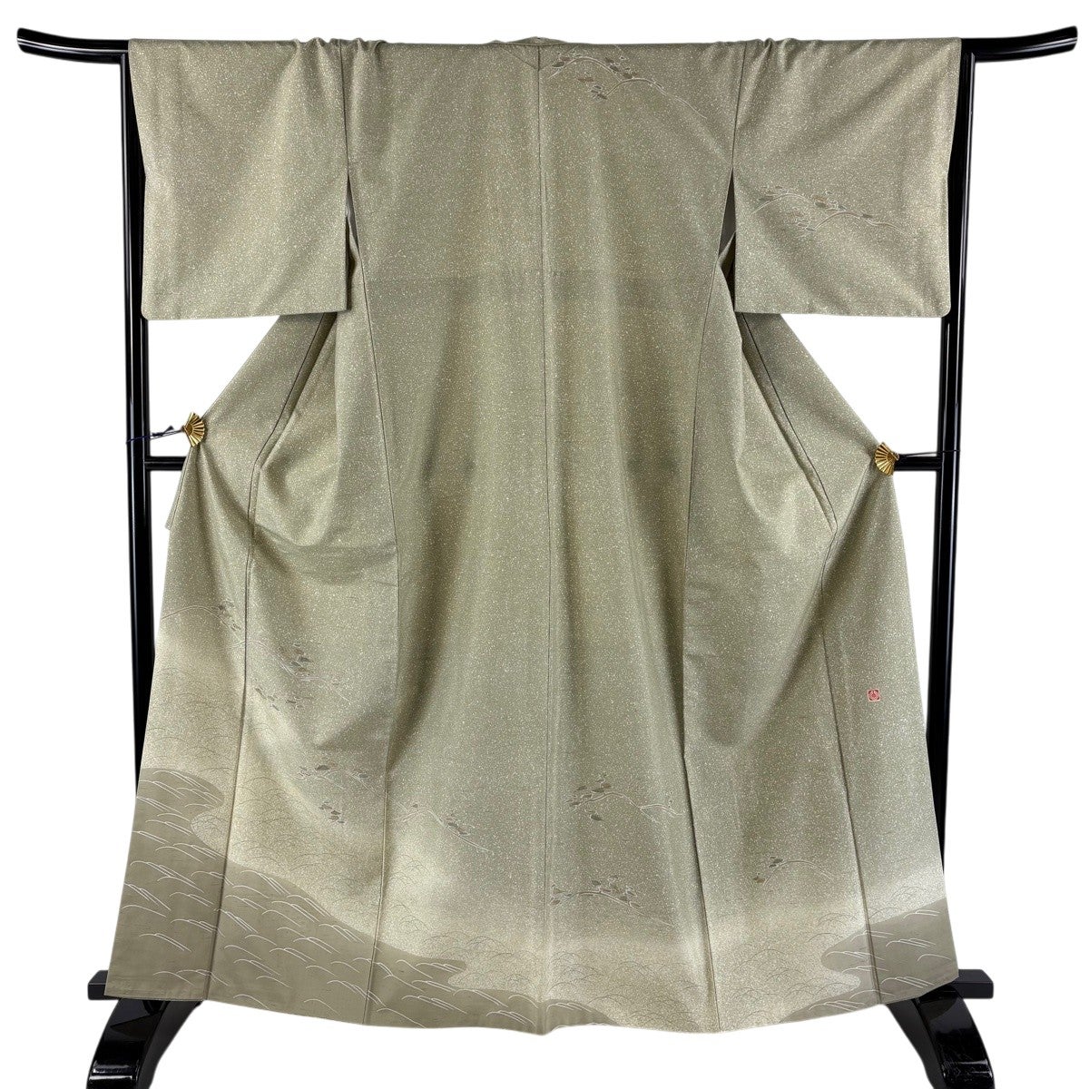 小紋 身丈156cm 裄丈65cm M 袷 山岡古都 落款あり 花鳥 青海波 紋意匠 灰色 正絹 逸品 一つ紋