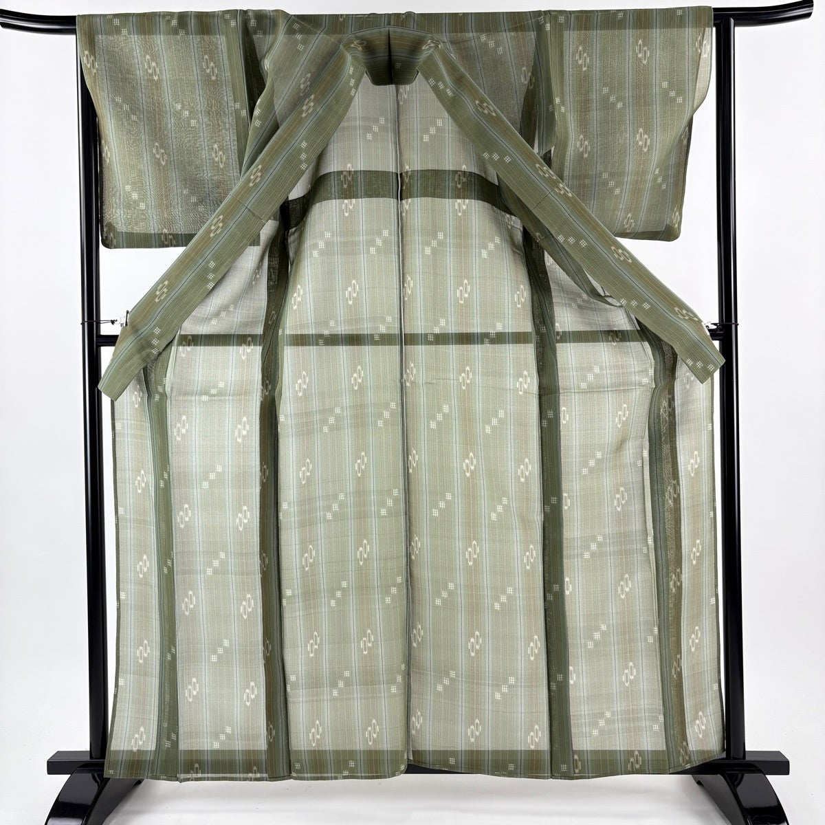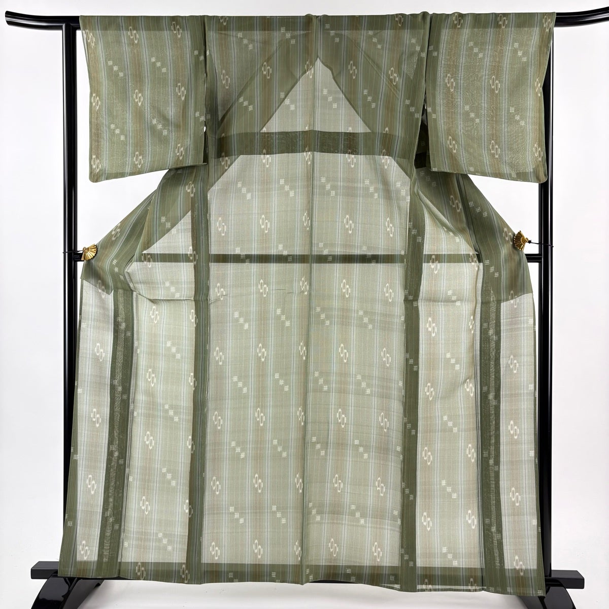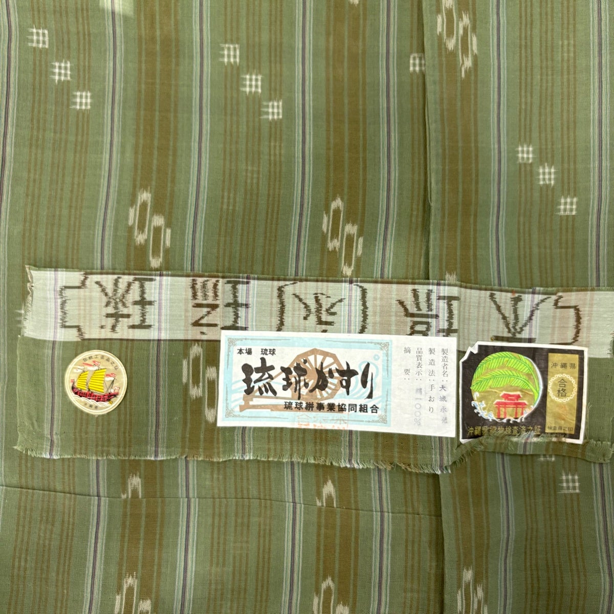 紬 身丈162cm 裄丈65cm M 薄物 夏紬 琉球かすり 証紙あり 縞 幾何学 よもぎ色 正絹 逸品