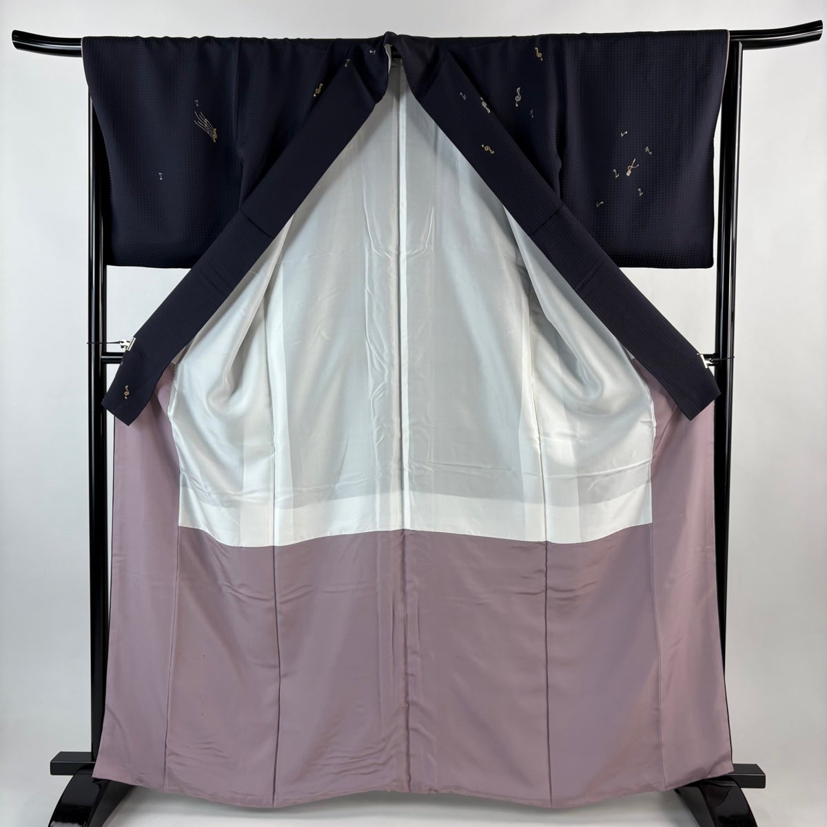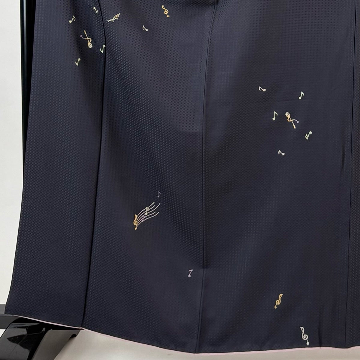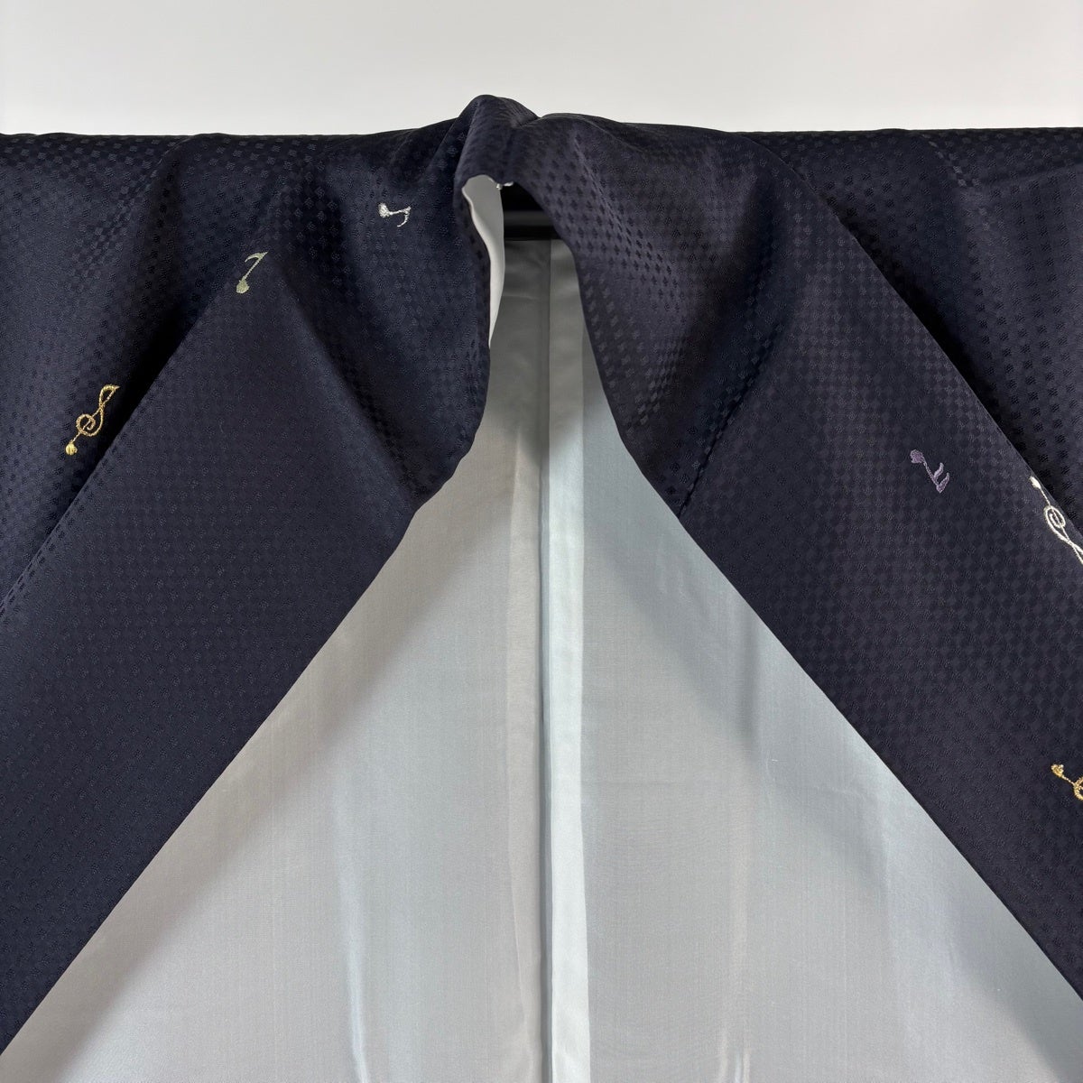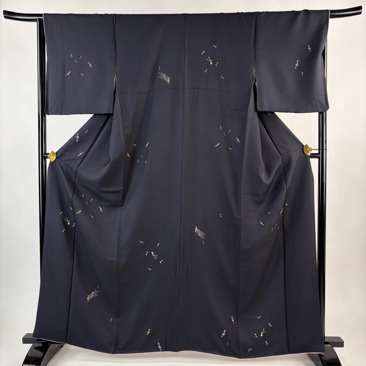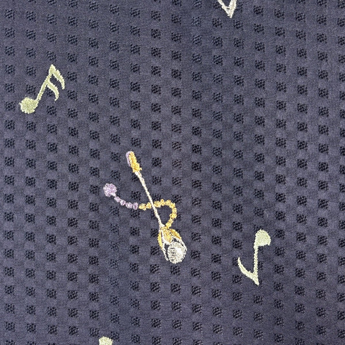 【美品】 小紋 身丈162.5cm 裄丈65.5cm M 袷 音符 ト音記号 金銀糸 刺繍 濃紺 正絹 逸品