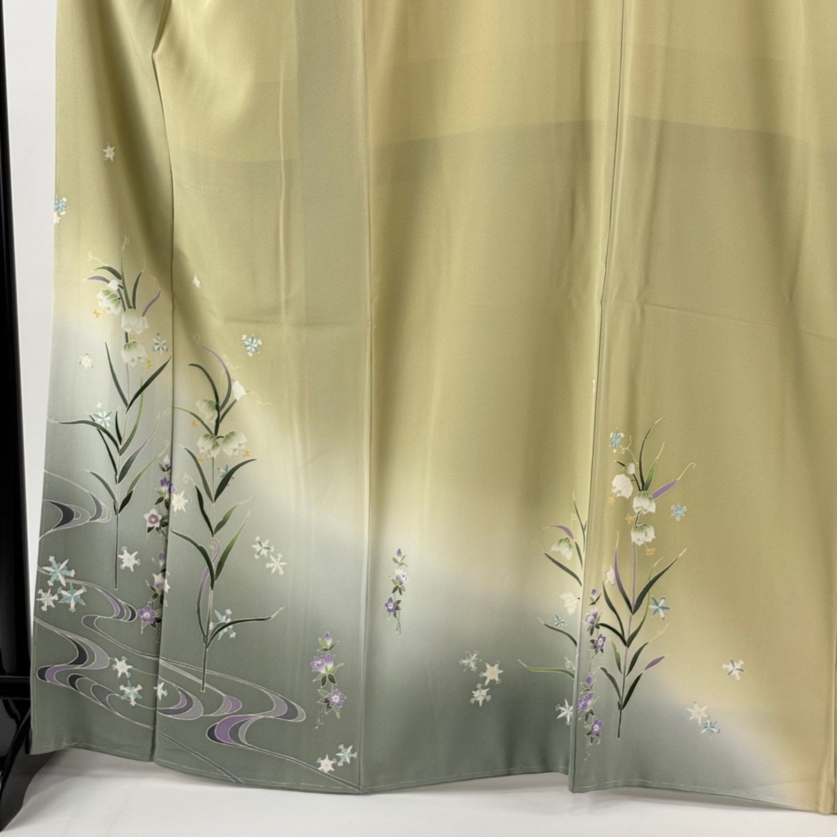 訪問着 身丈167cm 裄丈70cm L 袷 橋本しずか 加賀友禅 落款あり 草花 流水 ぼかし 灰緑 正絹 逸品