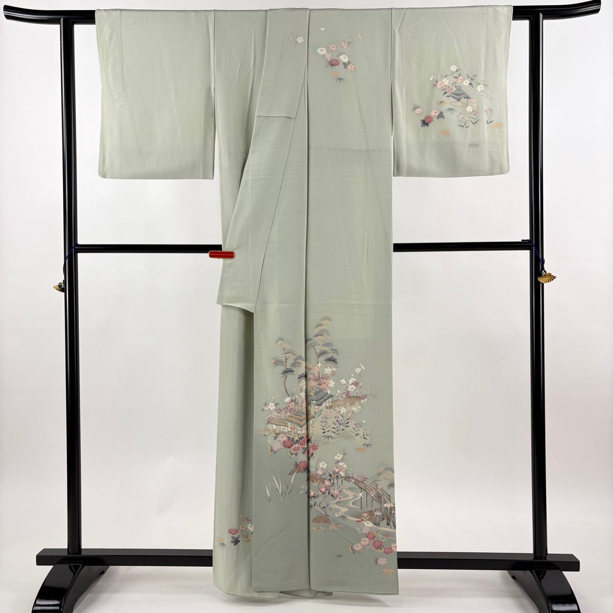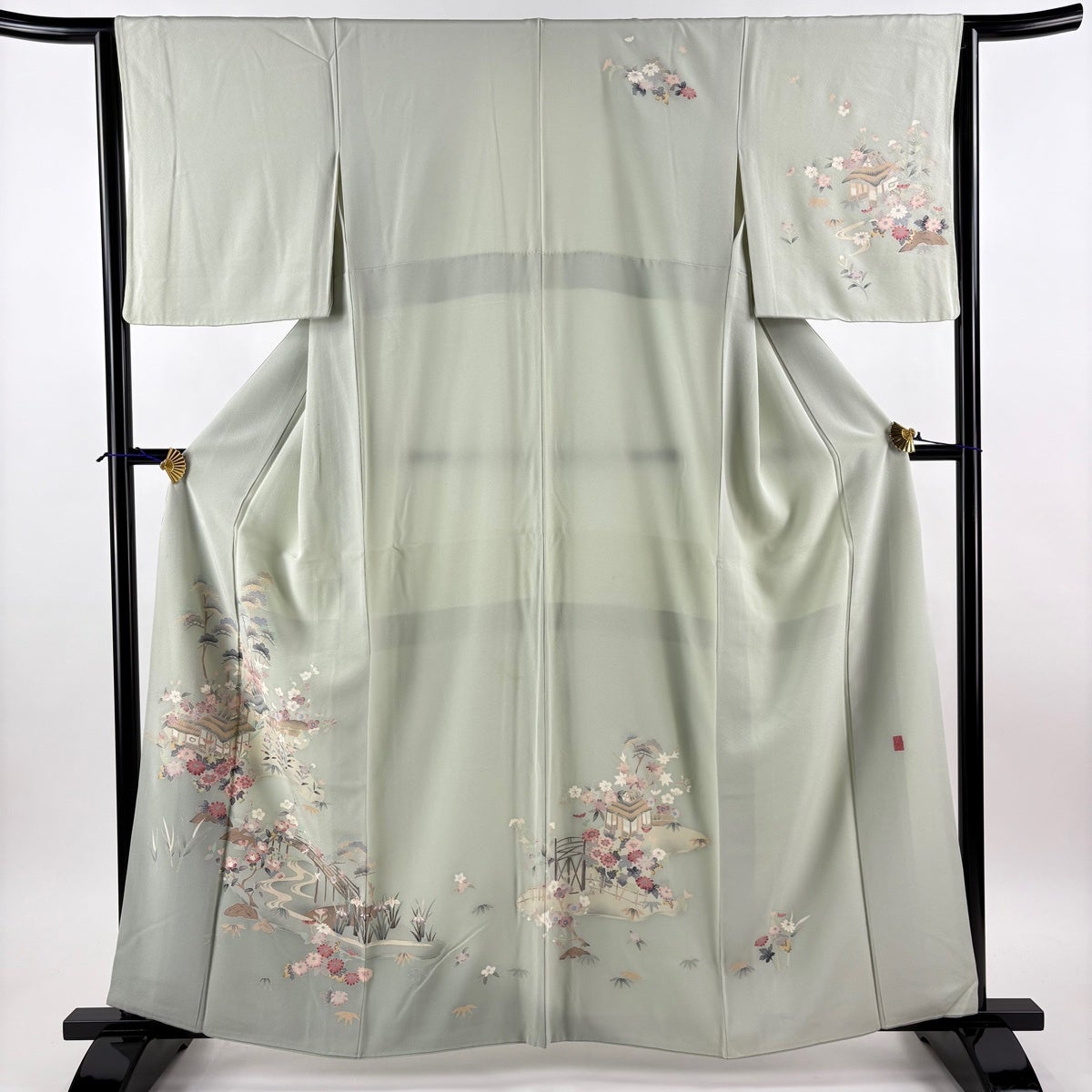 訪問着 身丈161cm 裄丈63cm S 袷 加賀友禅 和泉衛知 落款あり 松竹梅 家屋 ぼかし 薄緑 正絹 逸品