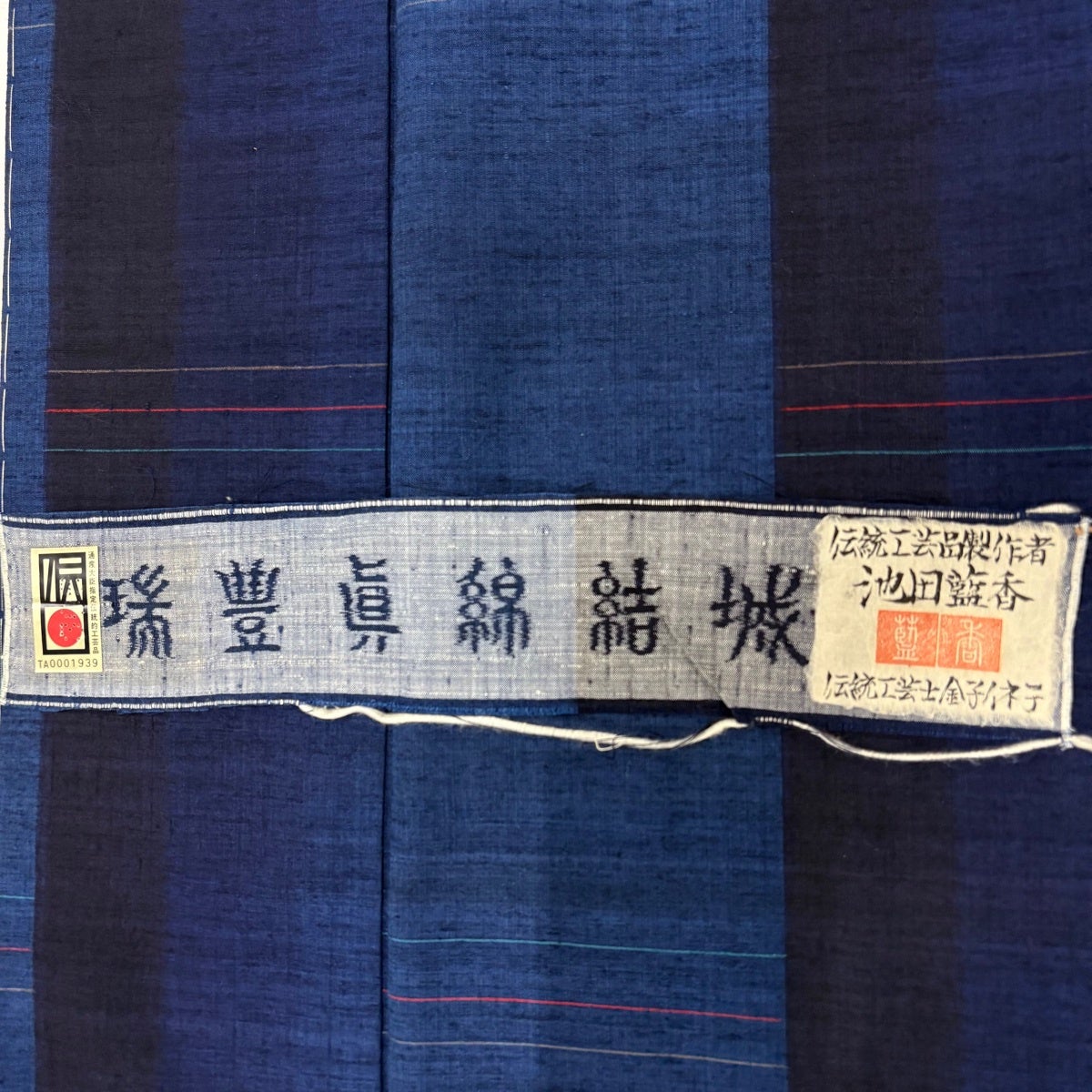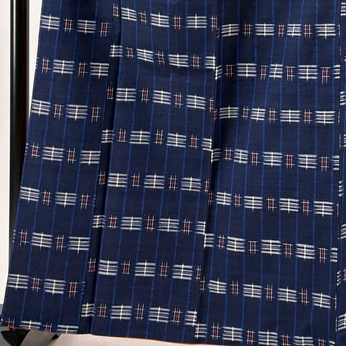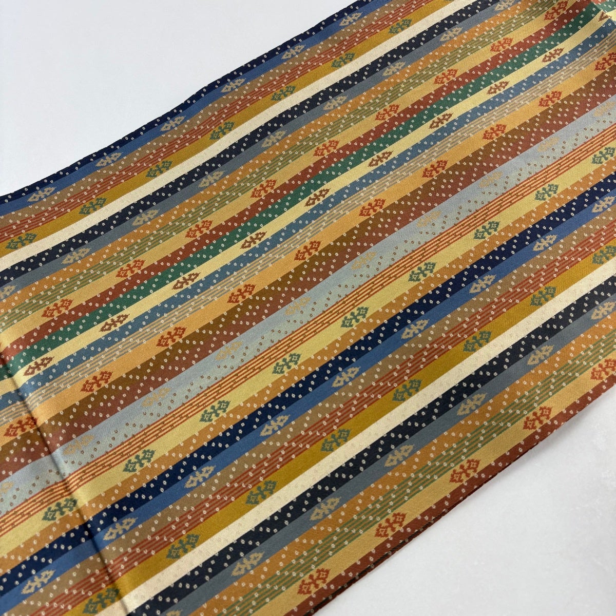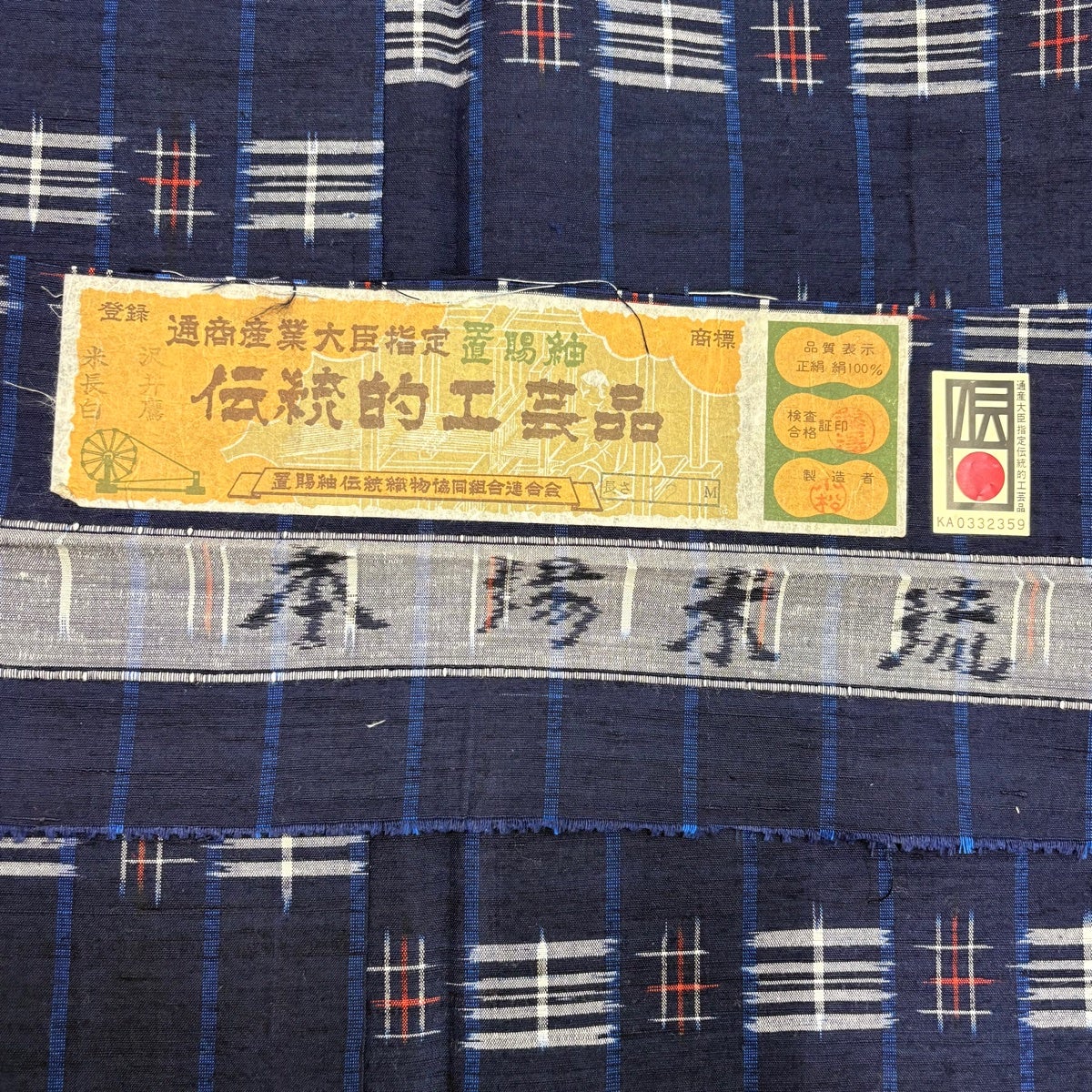紬 身丈163cm 裄丈64.5cm M 袷 置賜紬 証紙あり 縦縞 幾何学模様 紺色 正絹 逸品