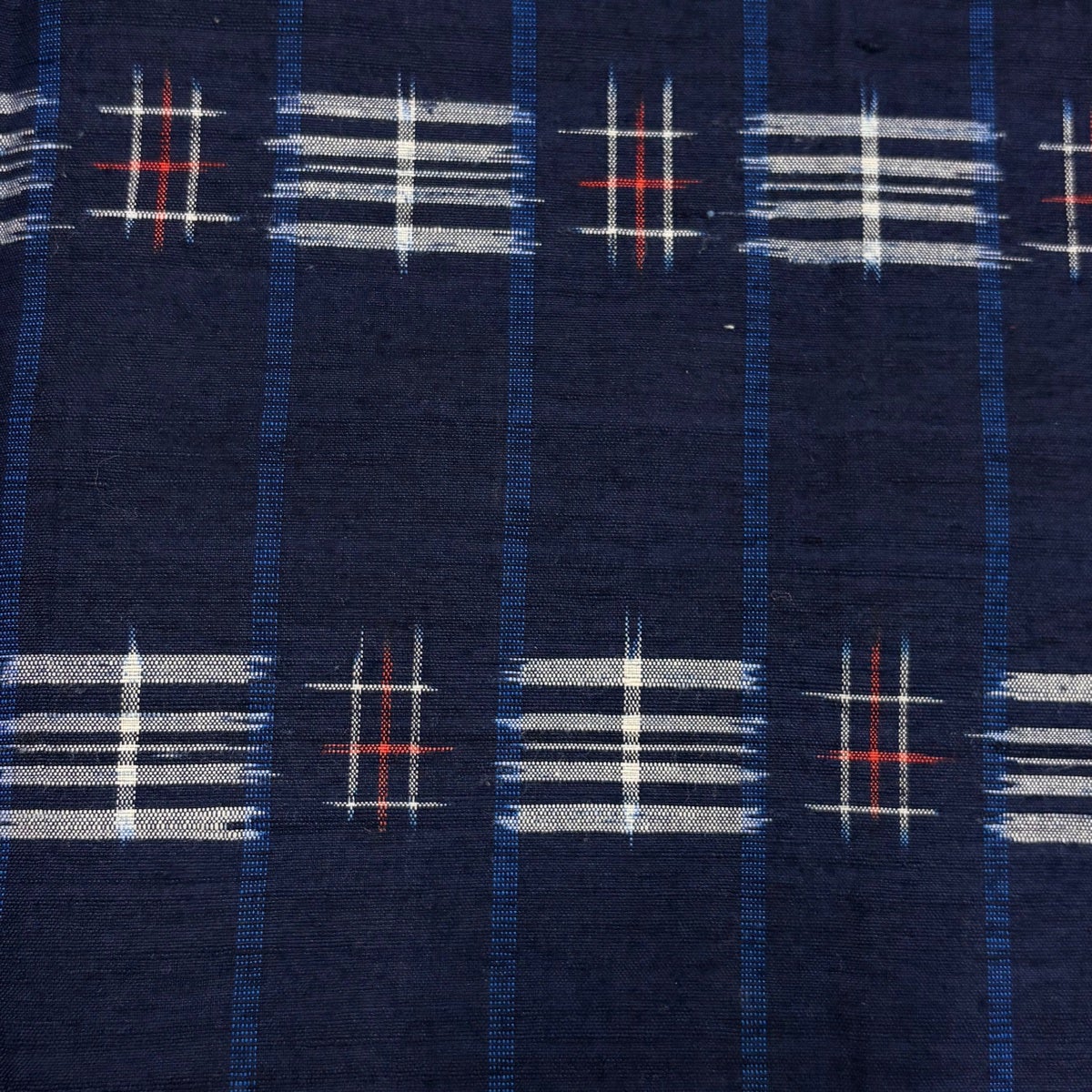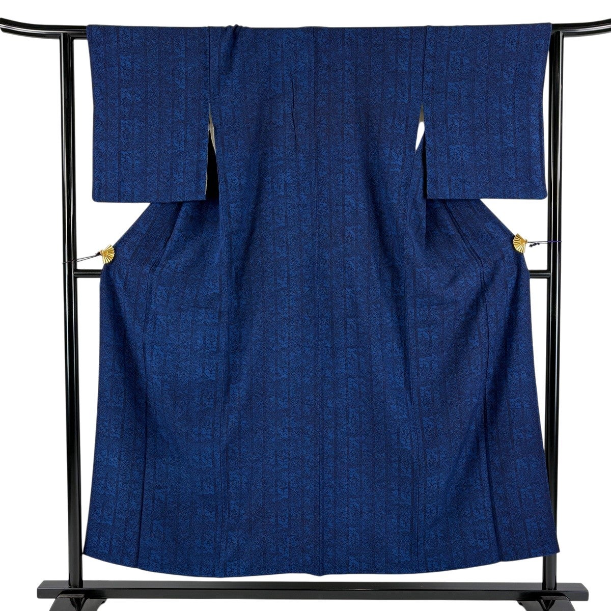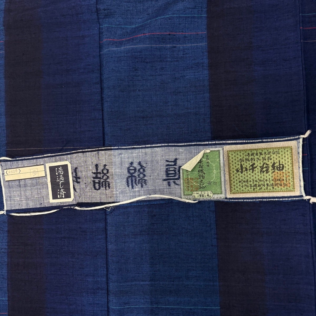 紬 身丈163cm 裄丈64.5cm M 袷 置賜紬 証紙あり 縦縞 幾何学模様 紺色 正絹 逸品