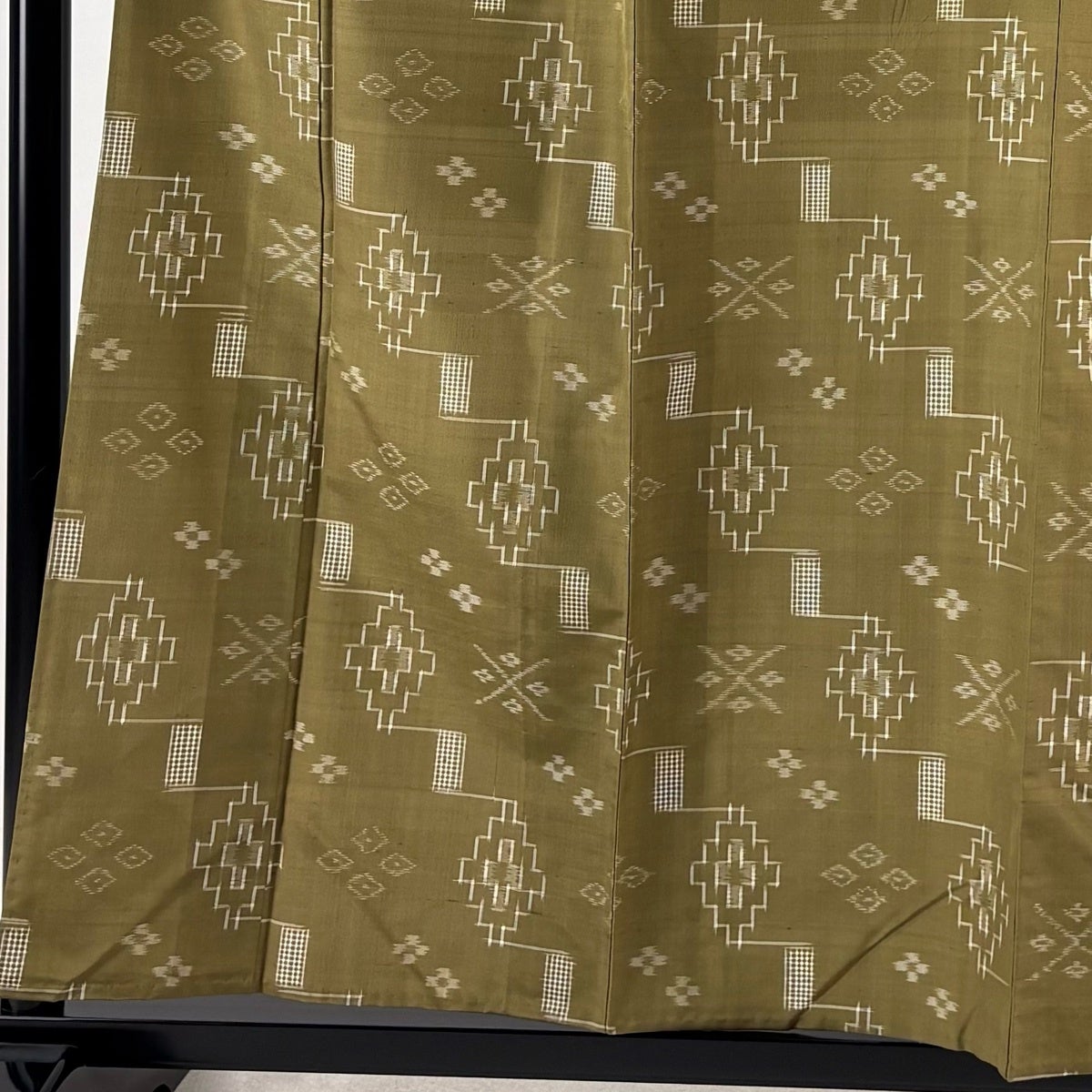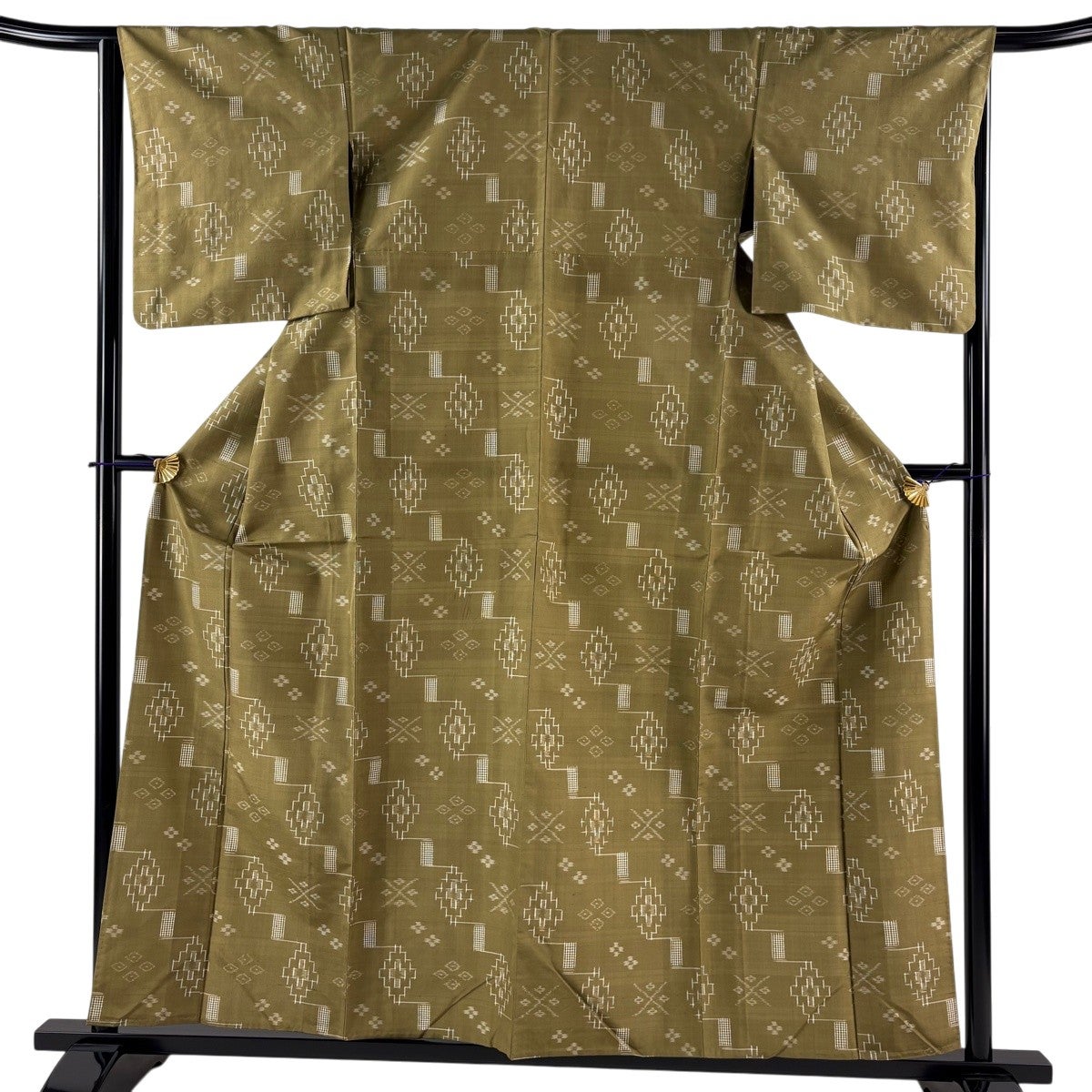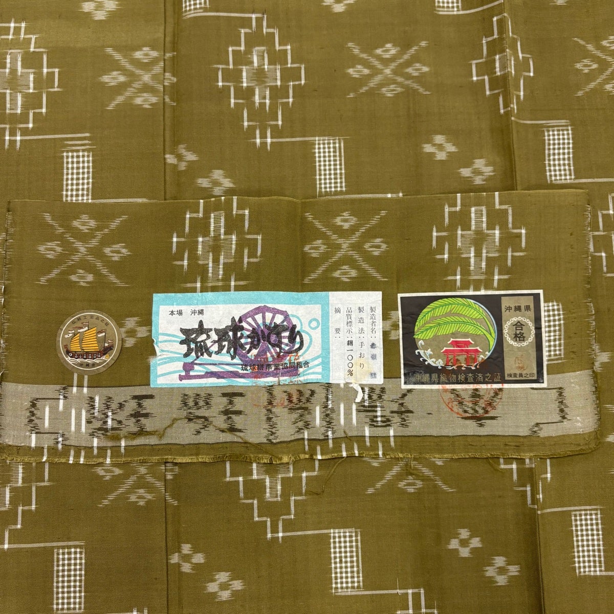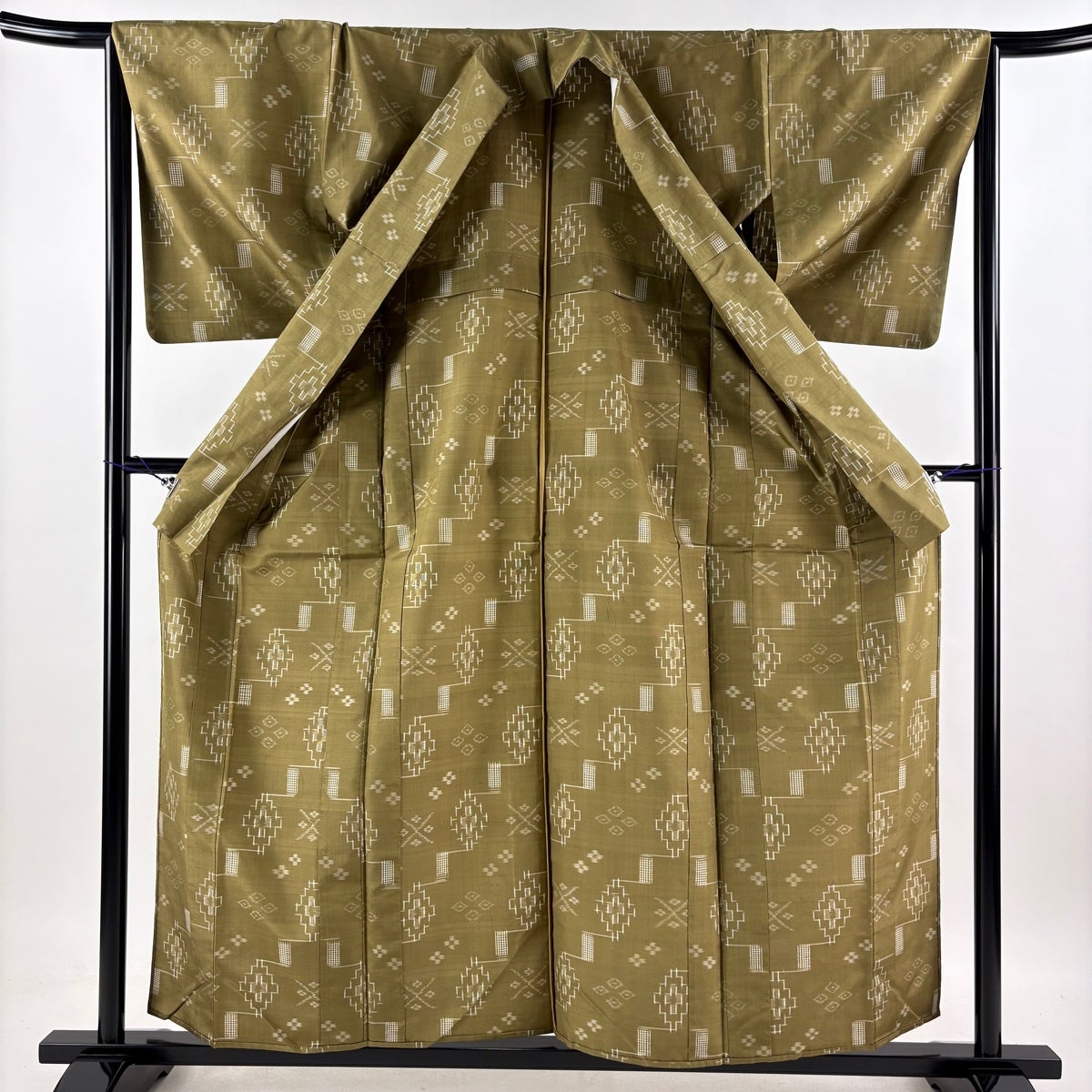 紬 身丈158.5cm 裄丈65cm M 単衣 琉球絣 証紙あり 幾何学模様 花 鶯色 正絹 逸品