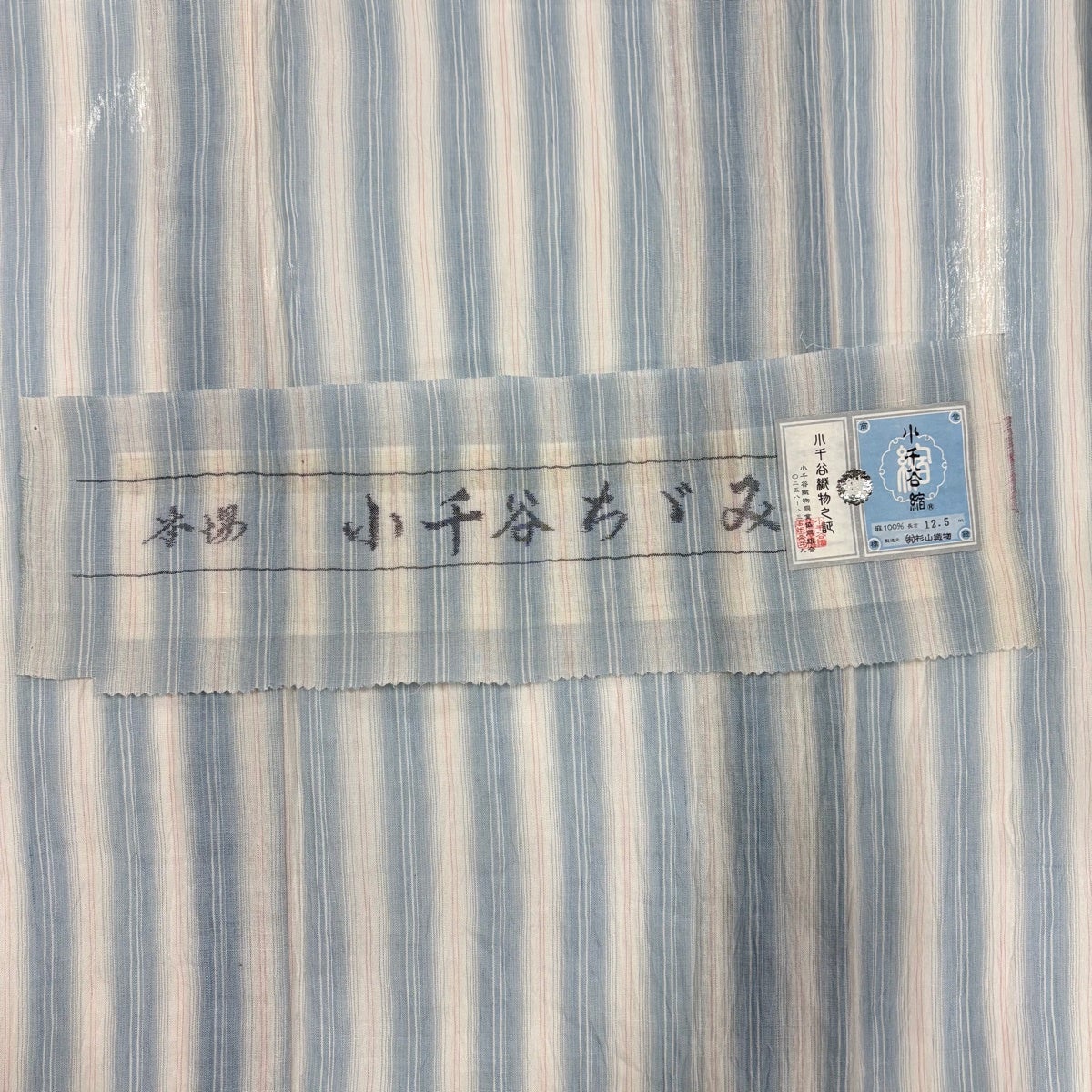 【美品】 紬 身丈163.5cm 裄丈66cm M 袷 小千谷紬 落款あり 証紙あり 縞 藍色 正絹 逸品