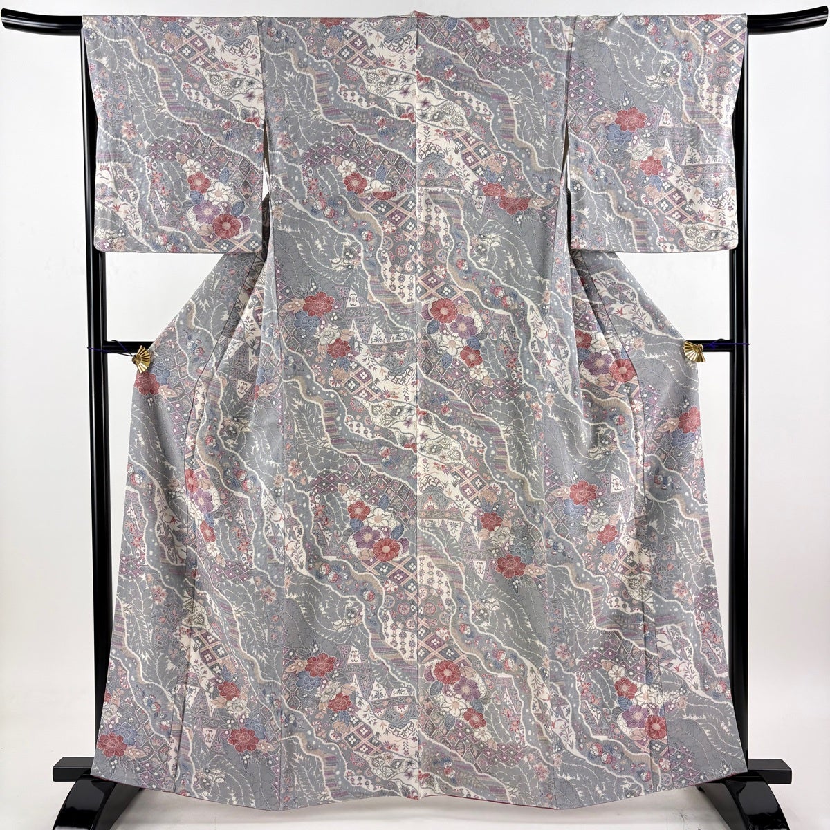 【美品】 付下げ 身丈166.5cm 裄丈65.5cm M 薄物 お召地 本塩沢 証紙あり 霞 青灰色 正絹 逸品 一つ紋