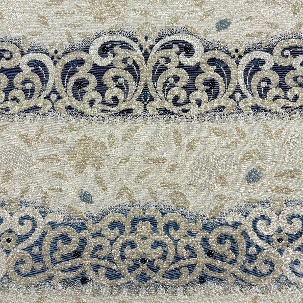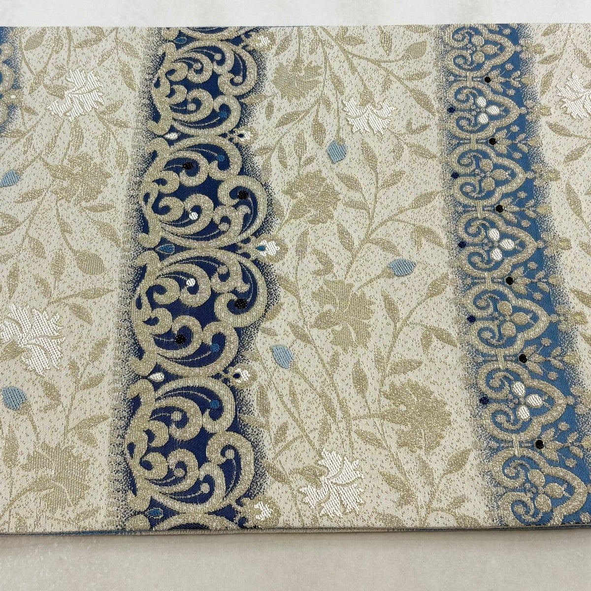 【美品】 袋帯 逸品 阿波藍染天然灰汁建 ティアラ 横段 草花 銀糸 箔 クリーム 全通 正絹
