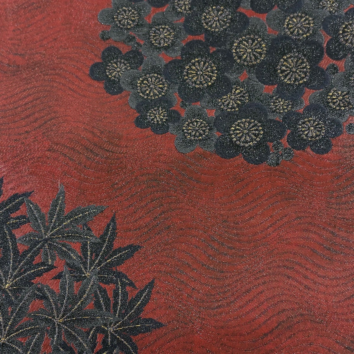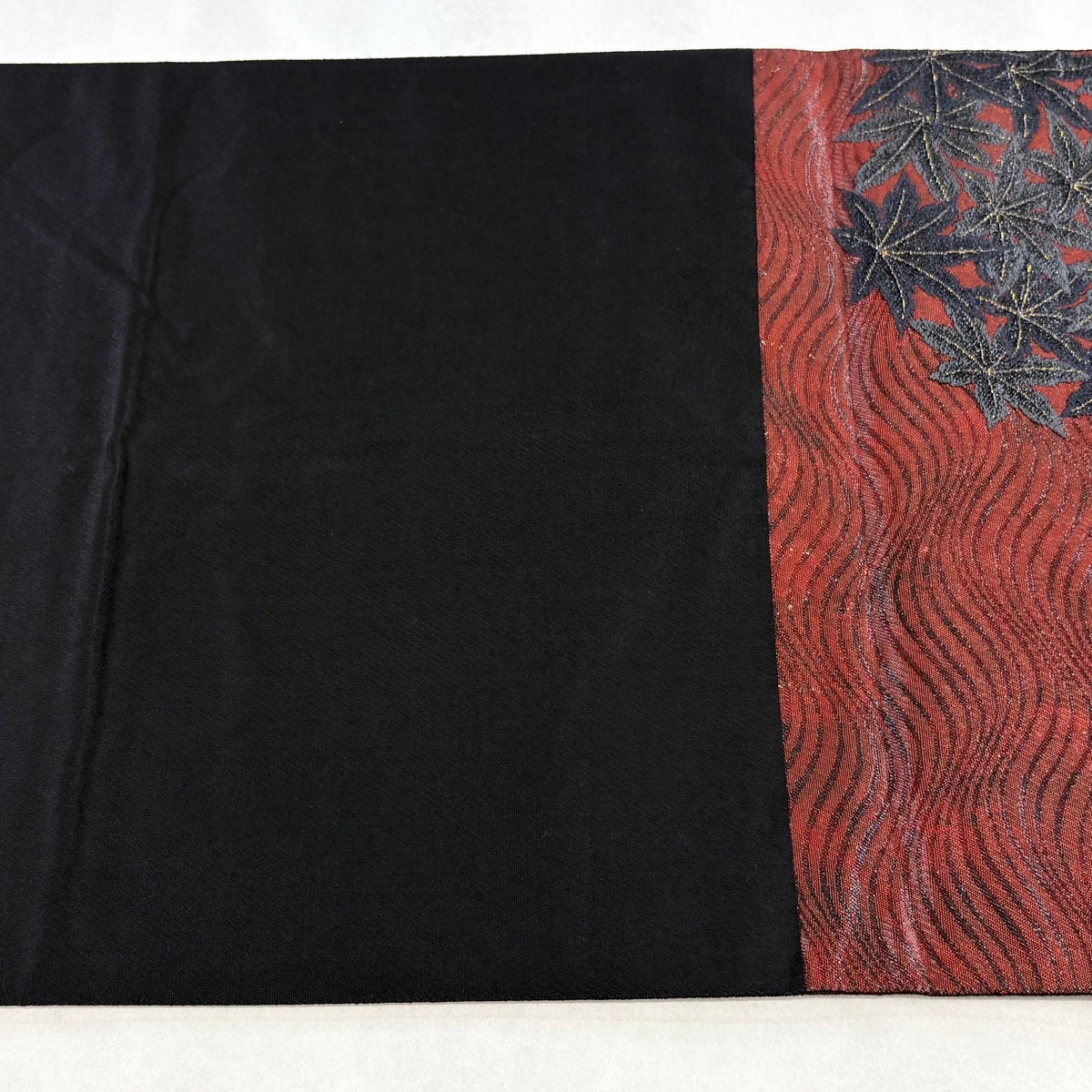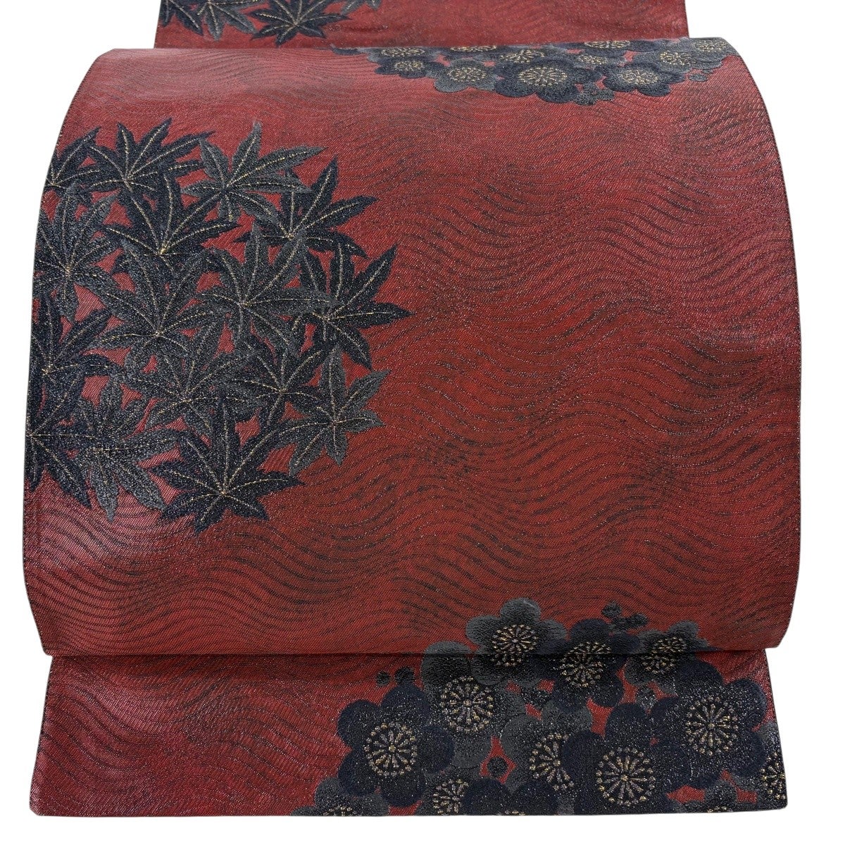 【美品】 袋帯 逸品 じゅらく 落款あり 梅 楓 箔 刺繍 赤茶 六通 正絹