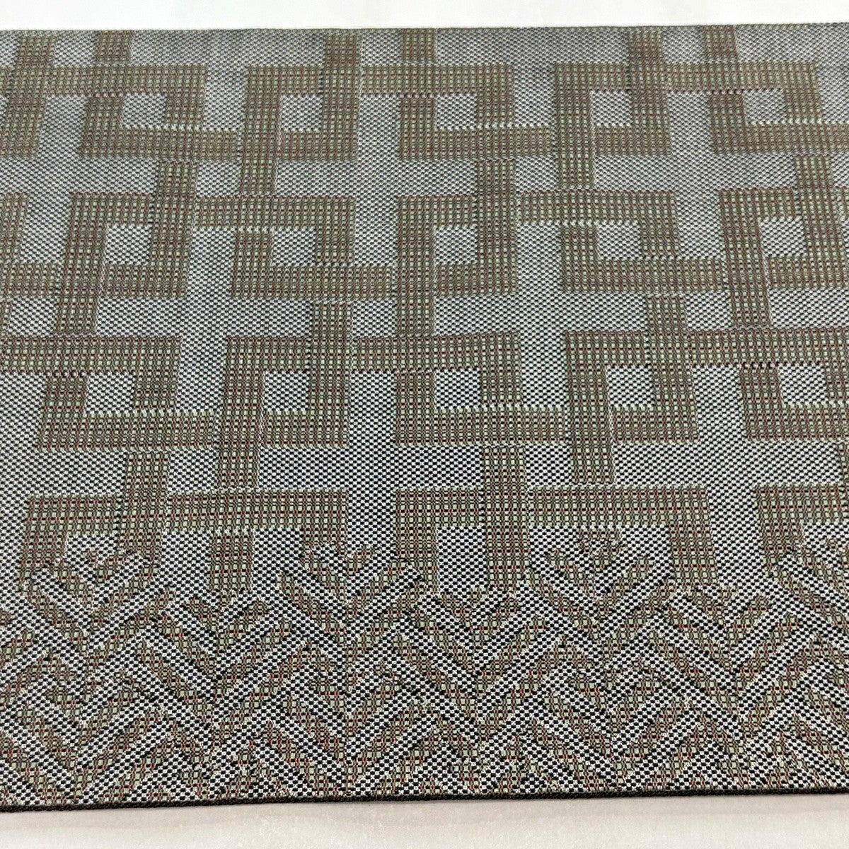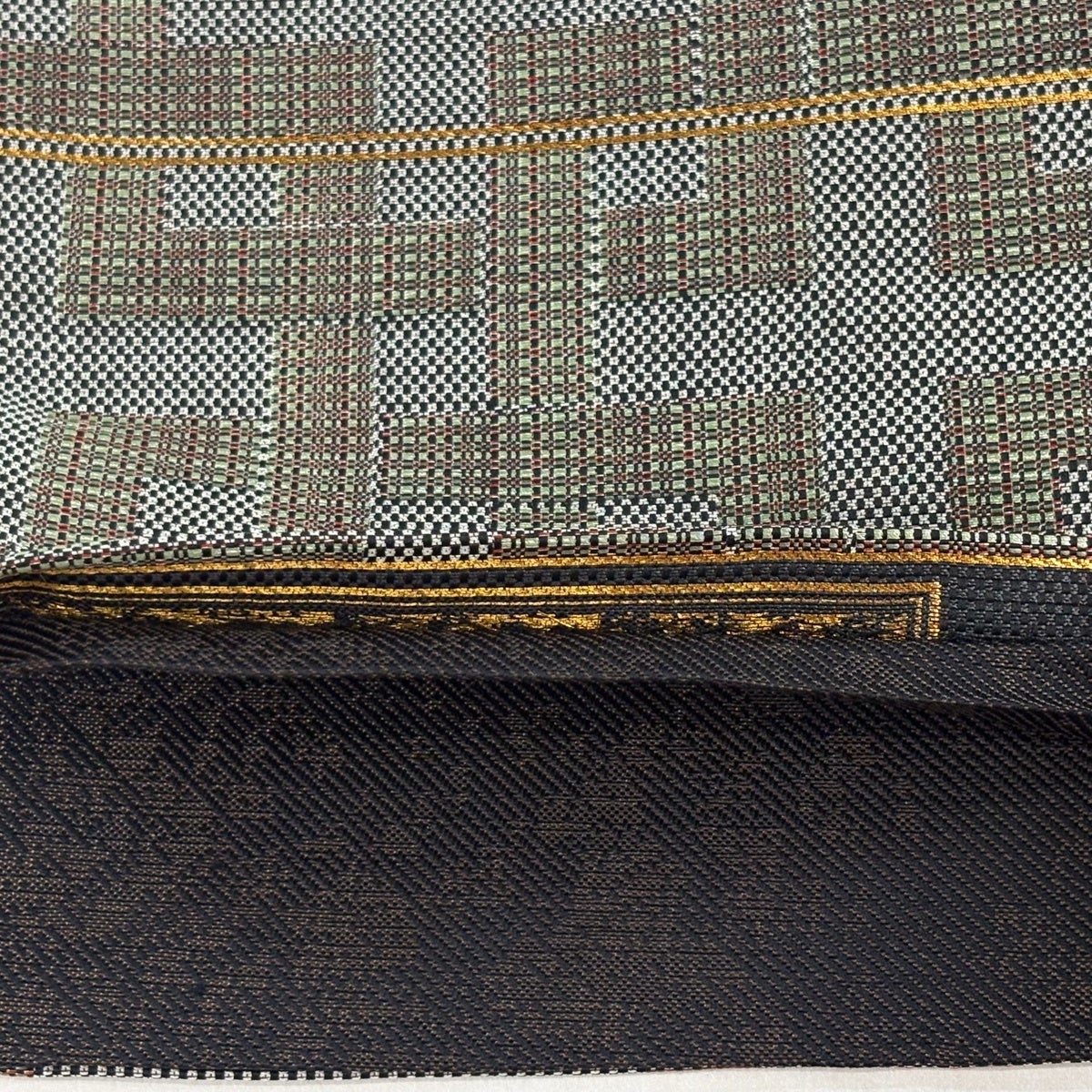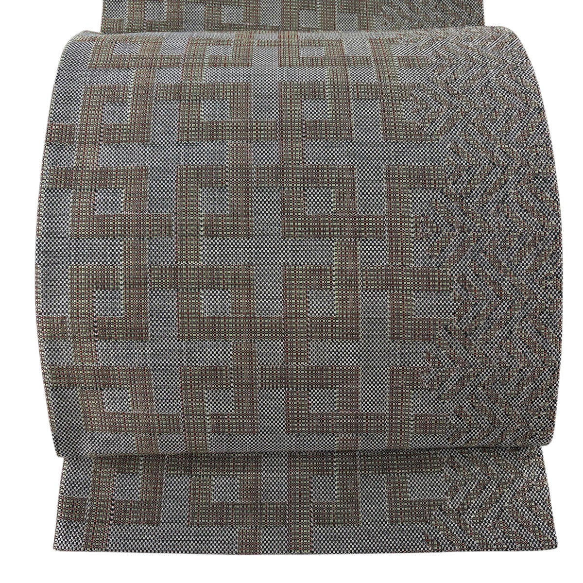 【美品】 袋帯 逸品 斉藤上太郎 落款あり 幾何学 銀糸 灰緑 全通 正絹