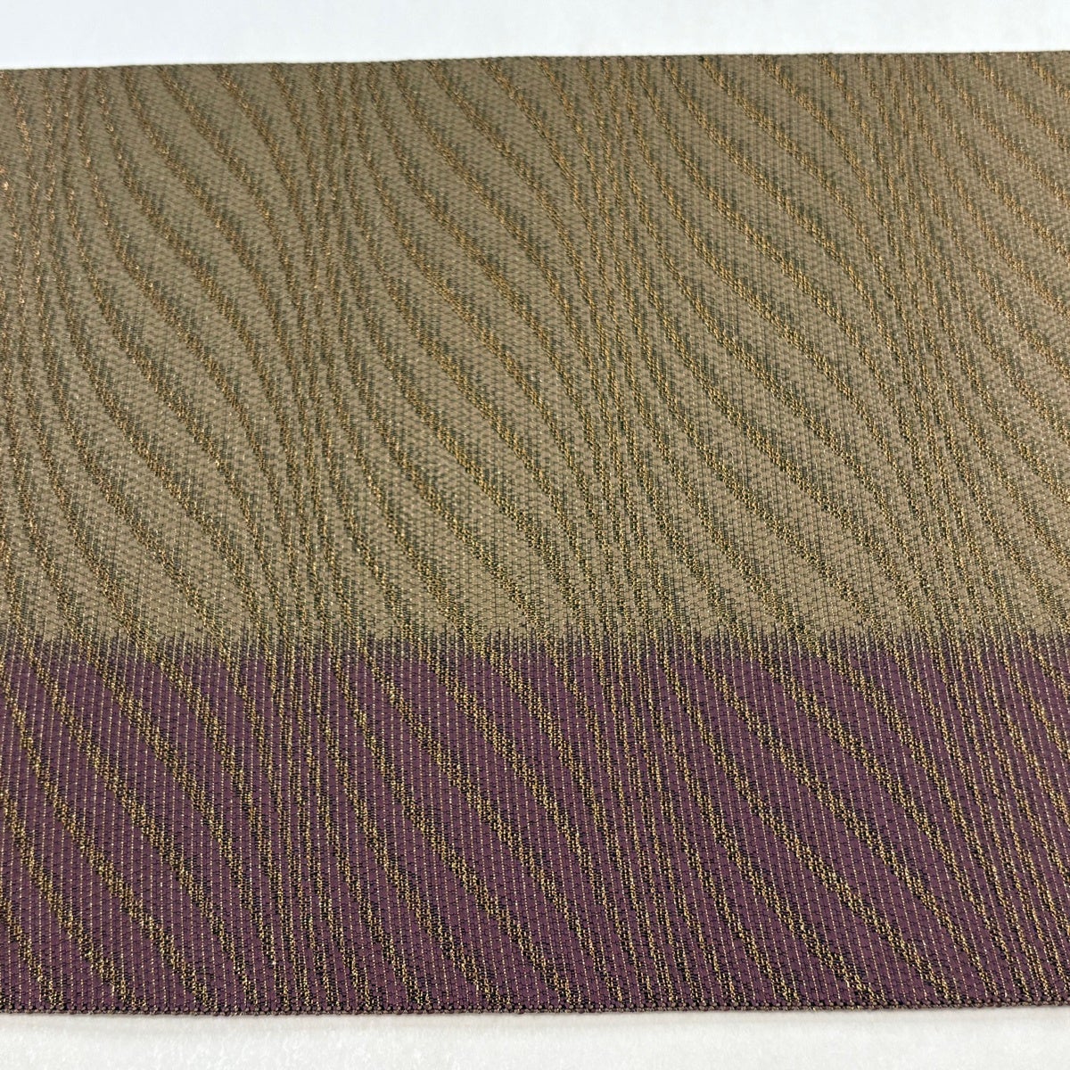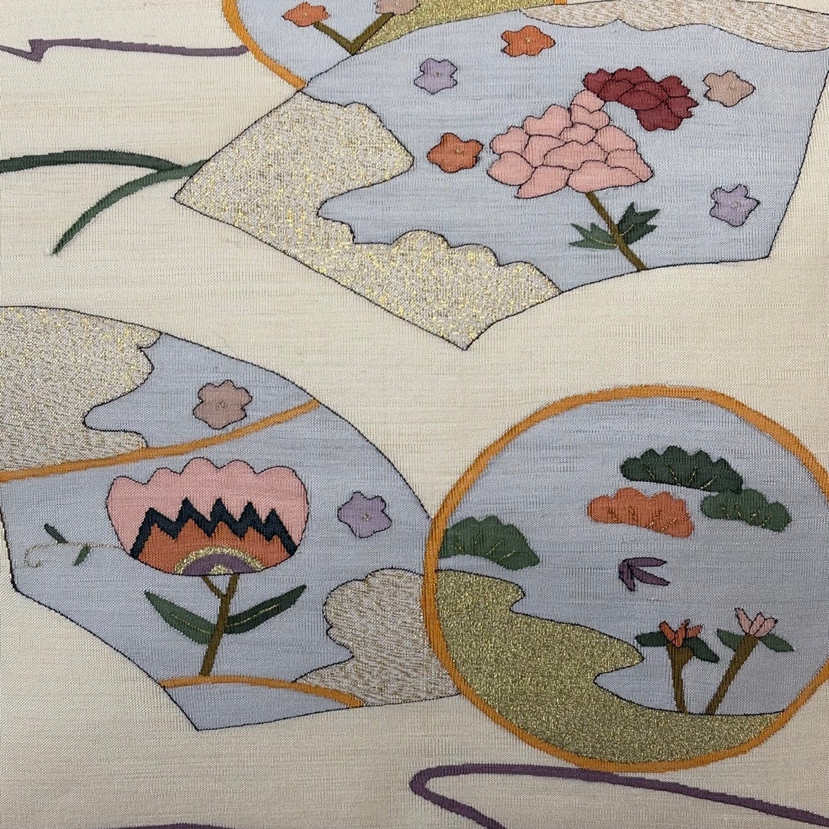 袋帯 逸品 落款あり 帝王紫 草花飾波形文 幾何学 金糸 箔 灰白 六通 正絹