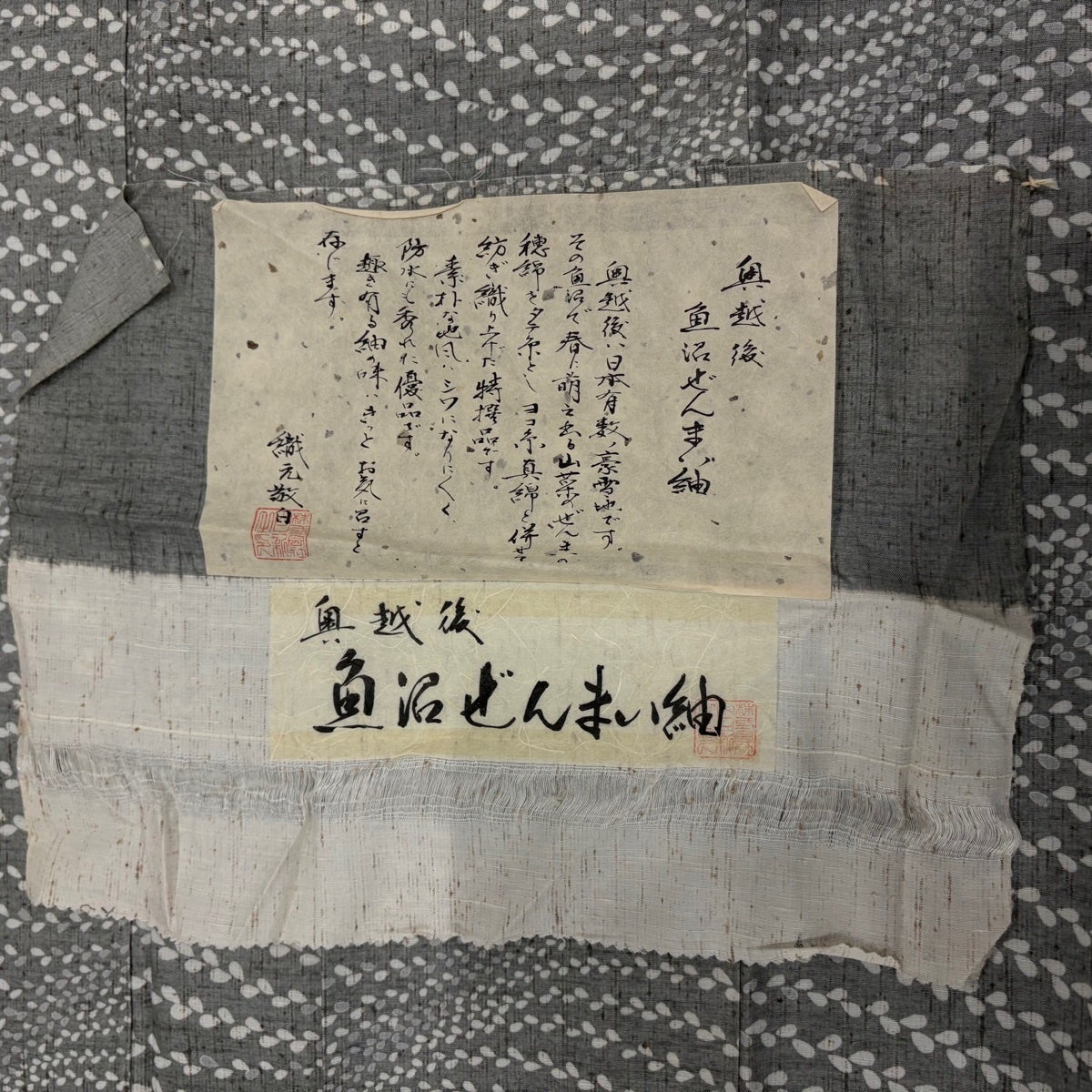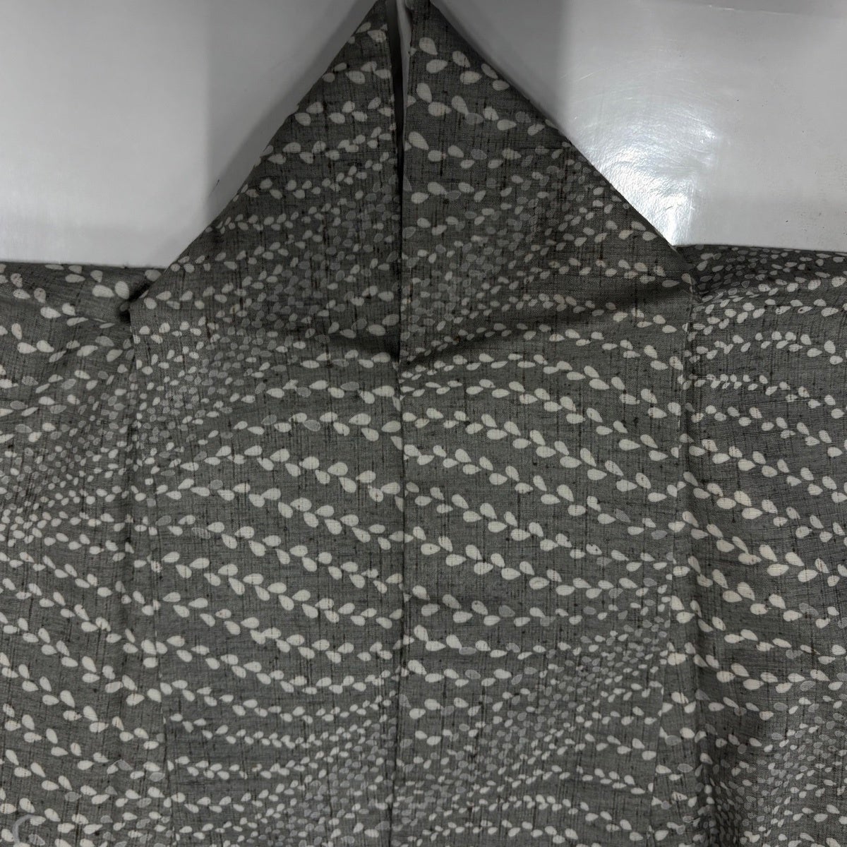 小紋 身丈159.5cm 裄丈63cm S 袷 魚沼ぜんまい紬 落款あり 証紙あり 葉 灰色 正絹 逸品