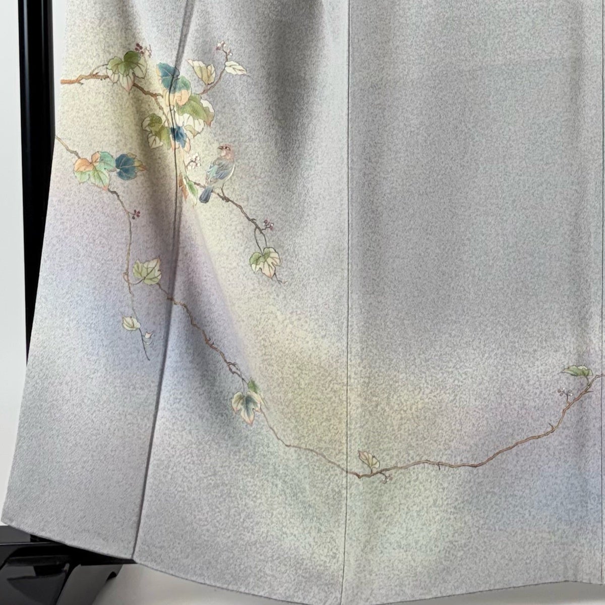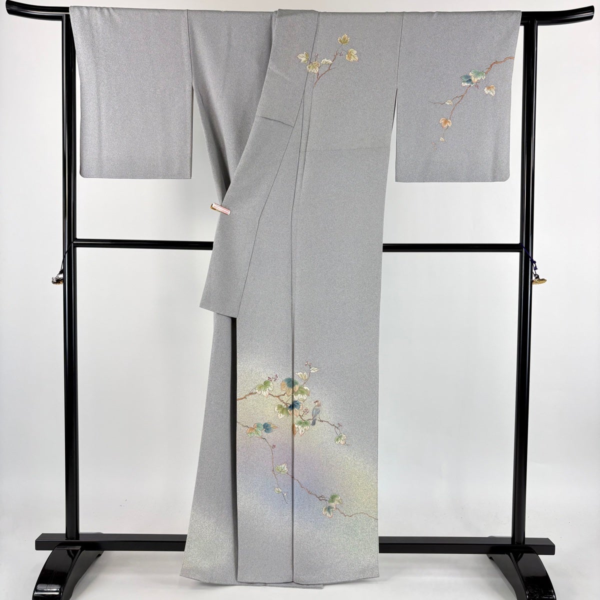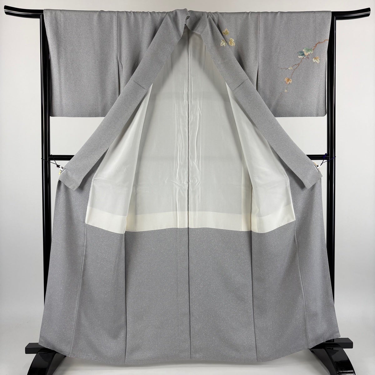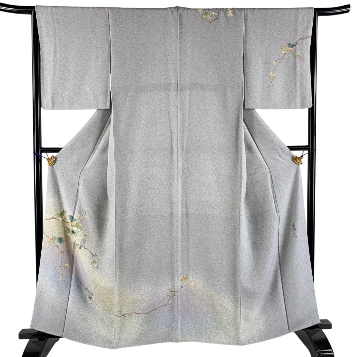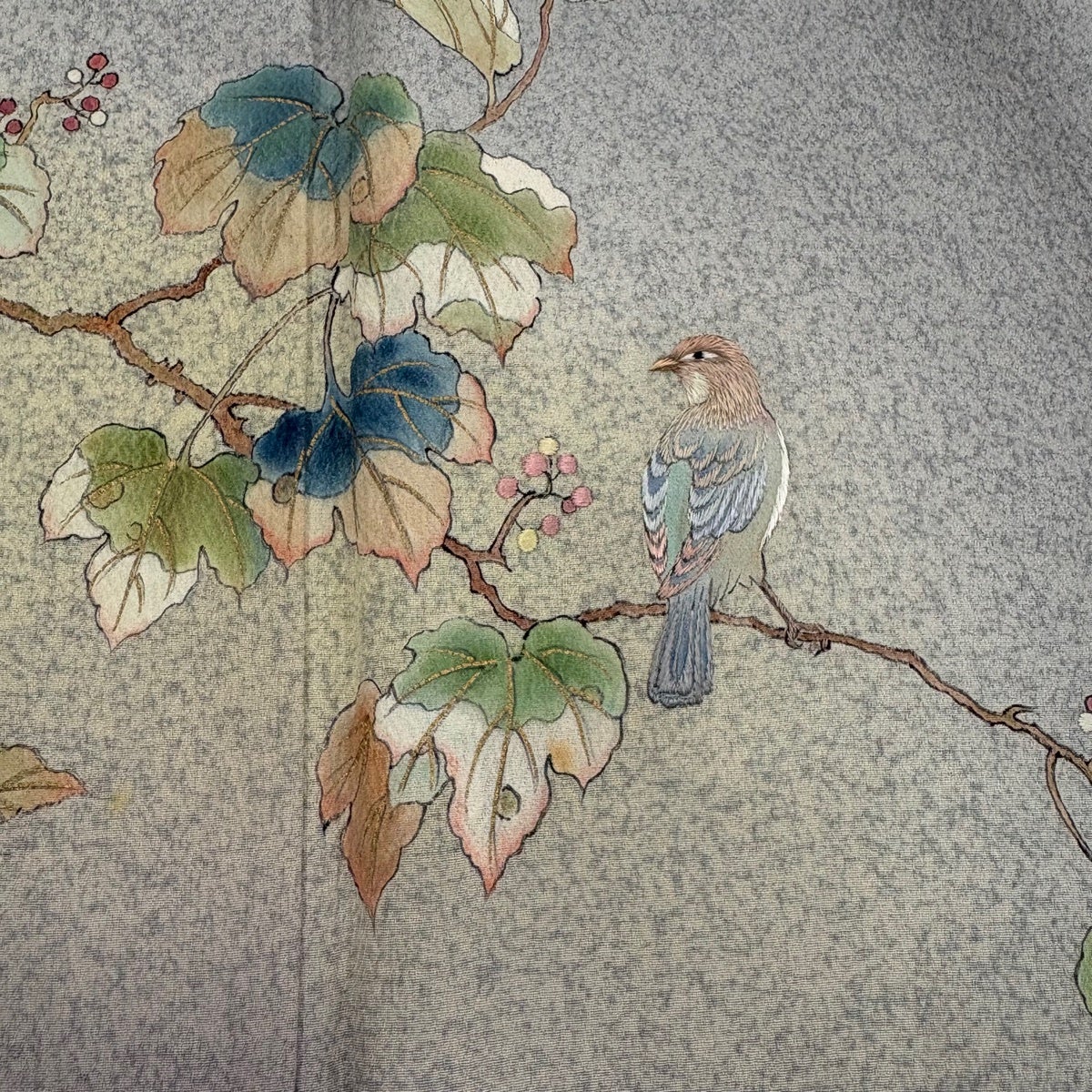 訪問着 身丈163cm 裄丈66cm M 袷 松井青々 落款あり 葉と実 鳥 刺繍 金彩 灰色 正絹 逸品