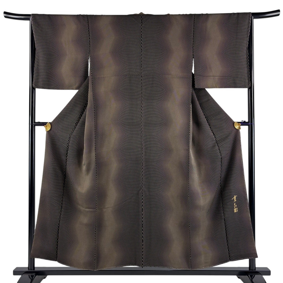 【美品】 小紋 身丈154.5cm 裄丈66.5cm M 袷 落款あり 幾何学模様 黒灰 正絹 逸品