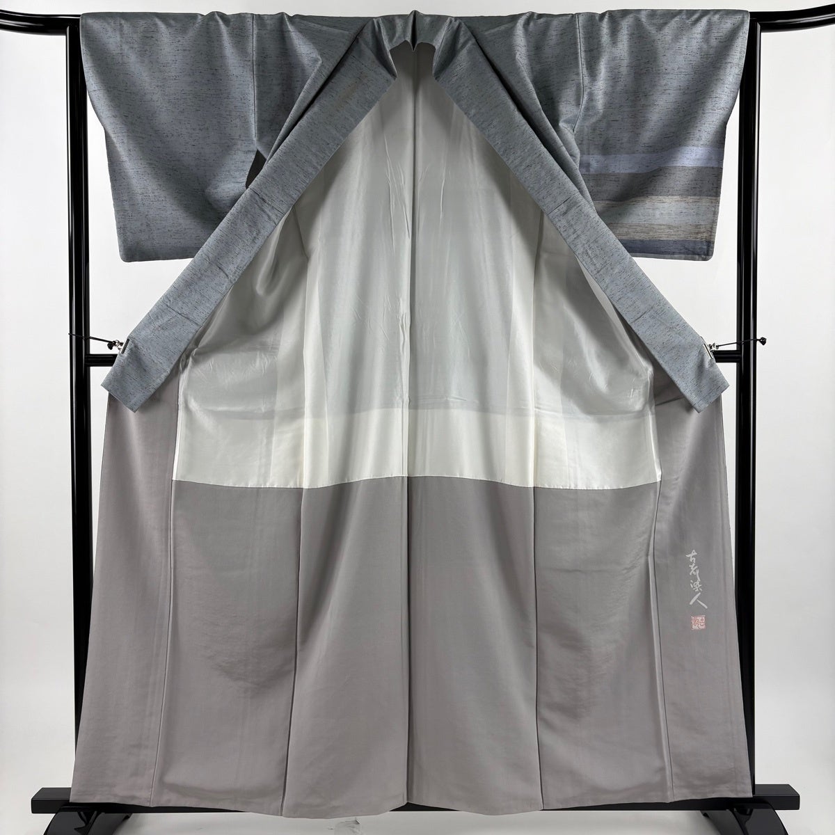 付下げ 身丈160.5cm 裄丈63.5cm S 袷 斉藤三才 落款あり 斜縞 鳥 染め分け ぼかし 灰色 正絹 名品 一つ紋