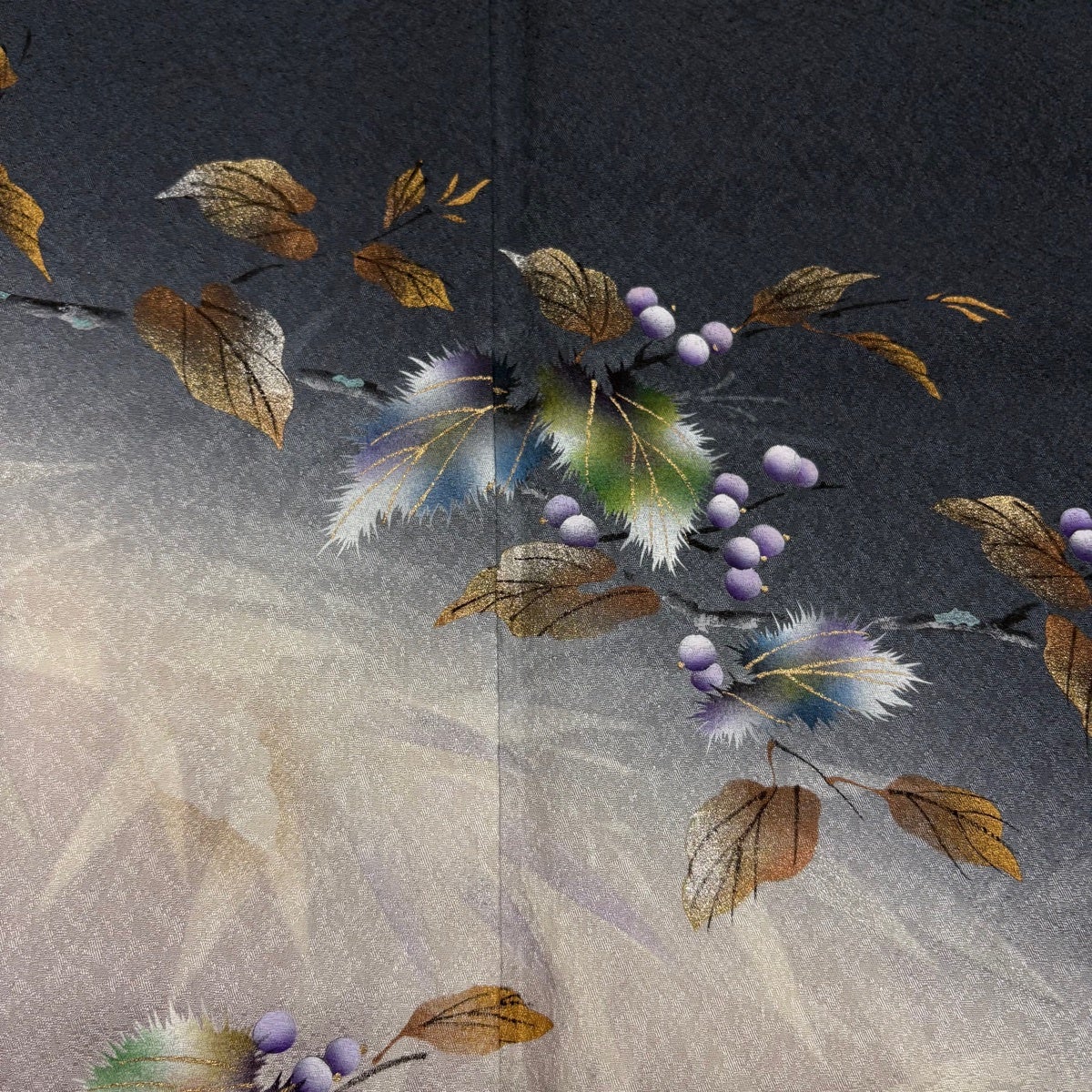 【美品】 付下げ 身丈160cm 裄丈67.5cm L 袷 やまと 落款あり 葉と実 笹 金彩 ぼかし 青灰色 正絹 名品