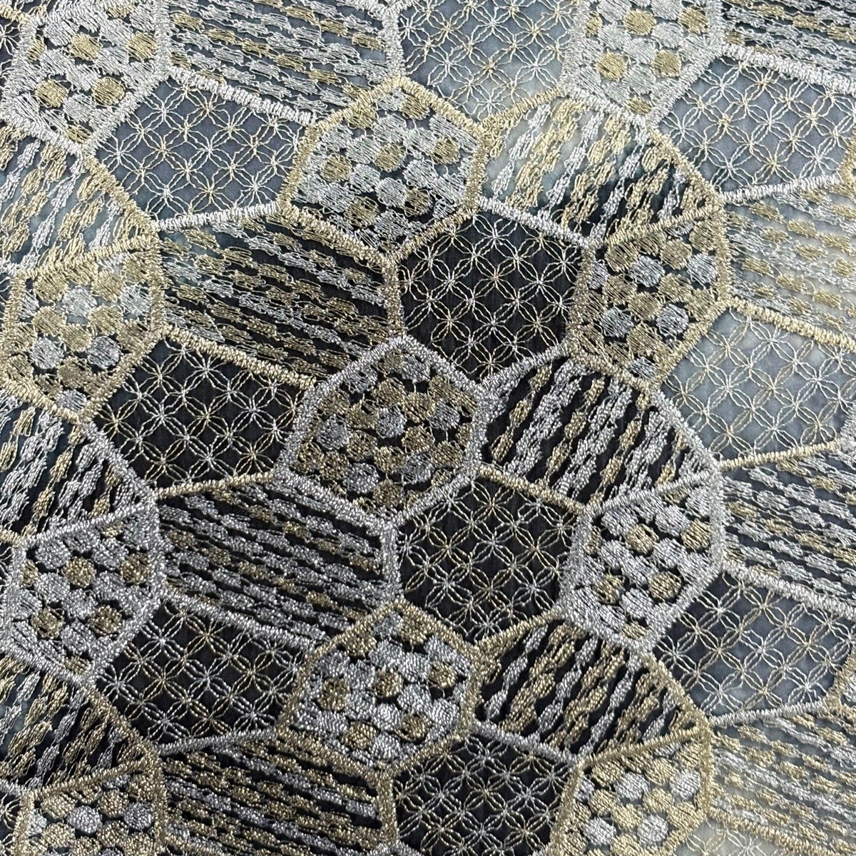名古屋帯 名品 麻の葉 草花 金銀糸 刺繍 灰色 正絹