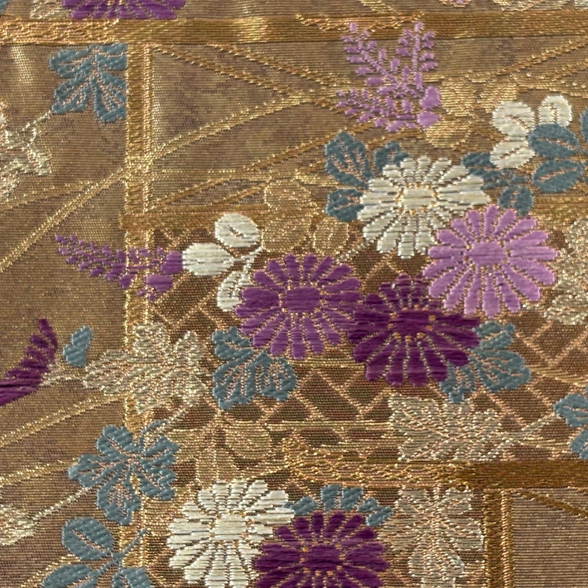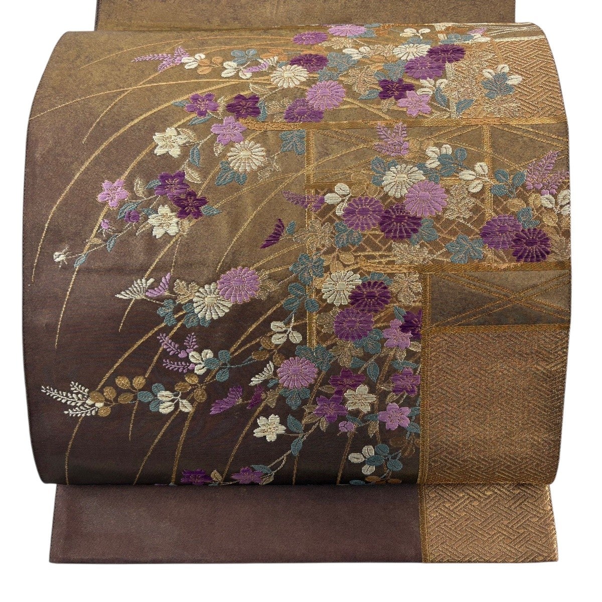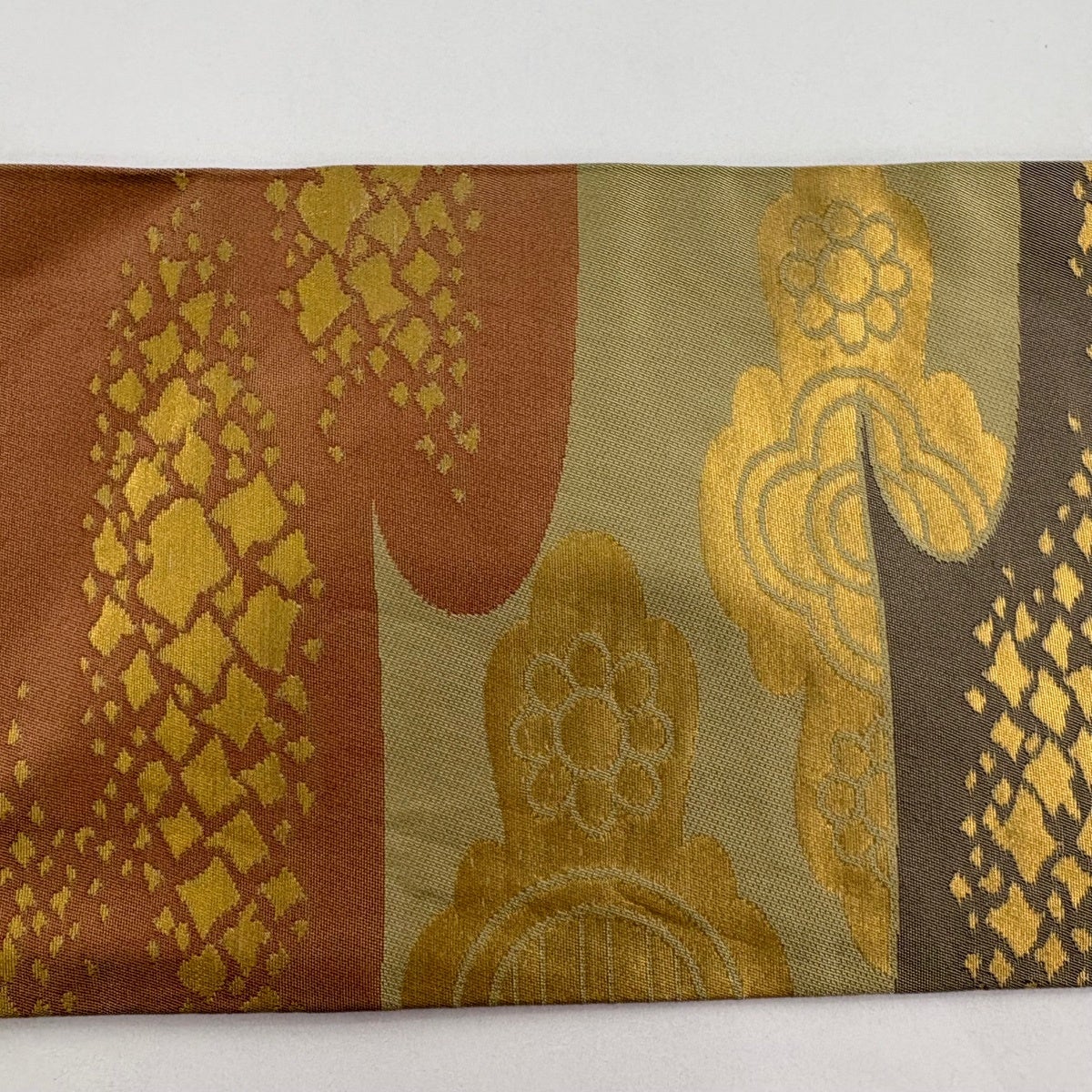 袋帯 秀品 織悦 落款あり 鱗 花 箔 灰茶 全通 正絹
