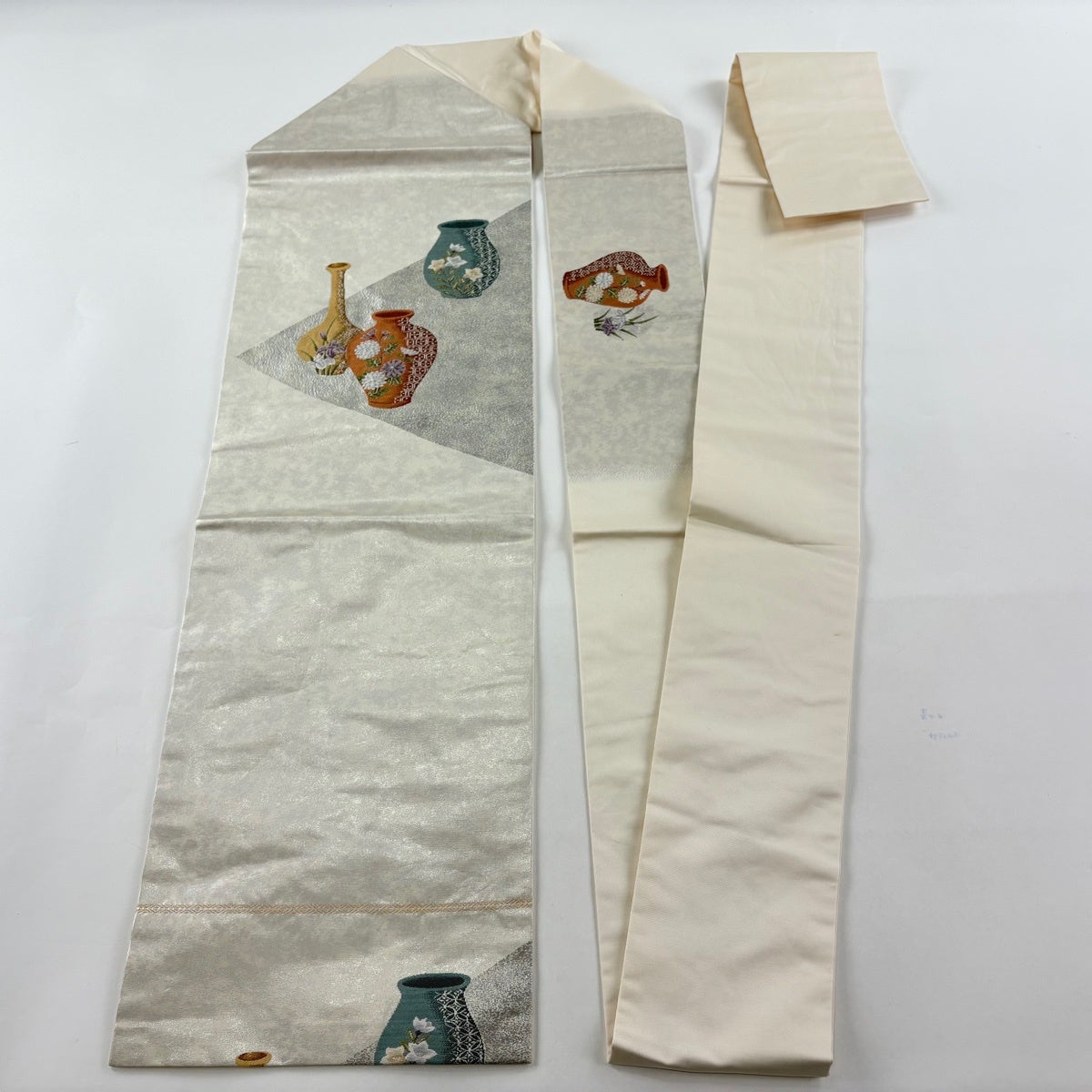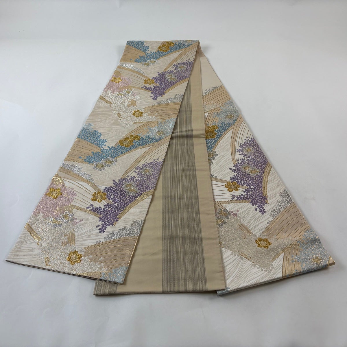 30%OFF 袋帯 秀品 夏帯 絽 草花 ヱ霞 金銀糸 ベージュ お太鼓柄 正絹 K30