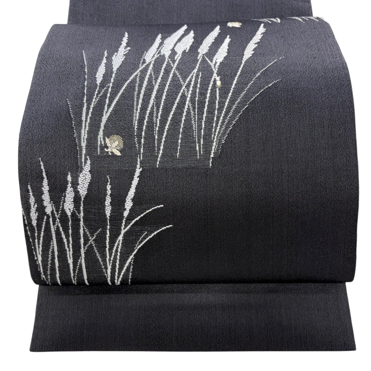 名古屋帯 秀品 夏帯 絽 草花 金銀彩 灰緑 正絹