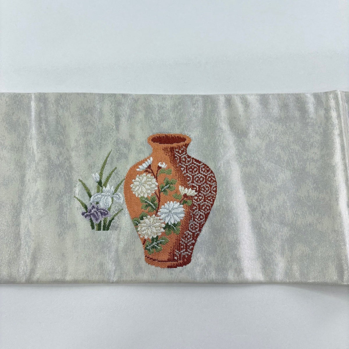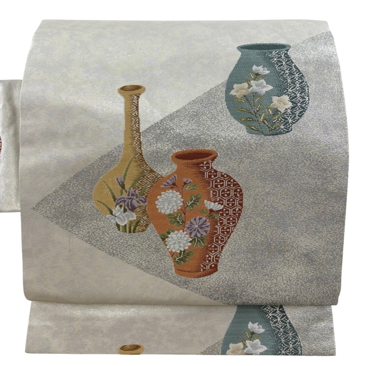 袋帯 名品 堀省平 落款あり 金螺織 草花 幾何学 金銀彩 箔 銀色 お太鼓柄 正絹