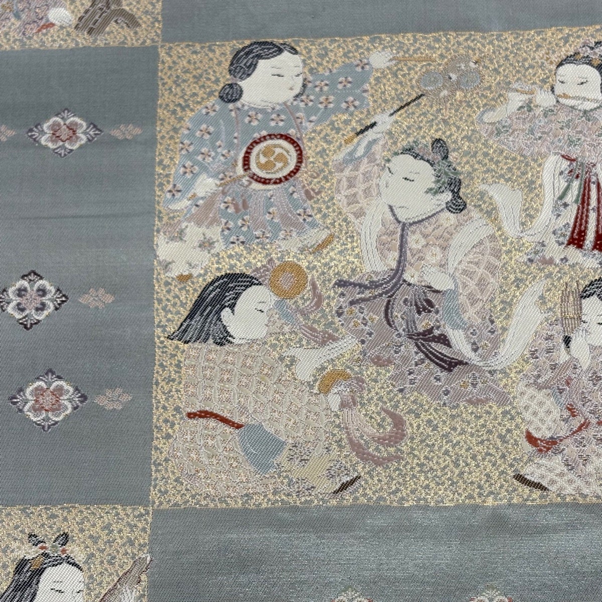 【在庫一掃】 袋帯 逸品 じゅらく 落款あり 扇 草花 金糸 箔 青灰色 六通 正絹