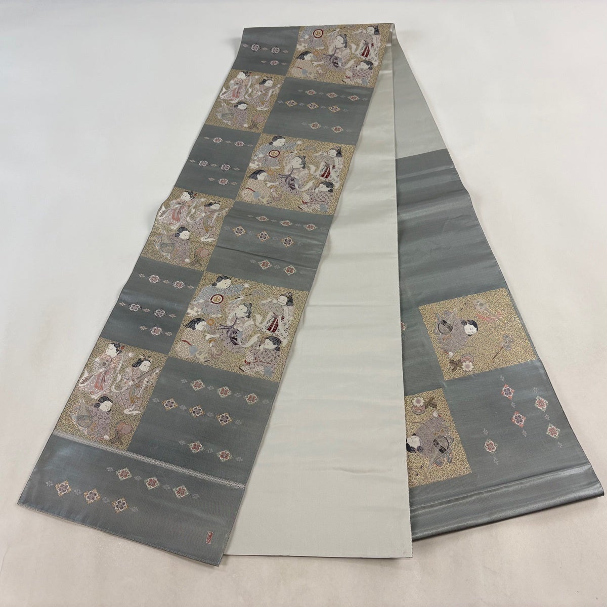 20%OFF 袋帯 逸品 洛陽織物 落款あり 花唐草 鳥 箔 金銀糸 灰色 六通 正絹 K30
