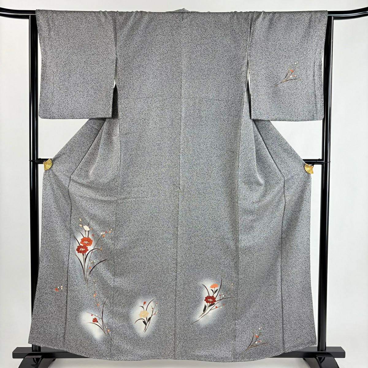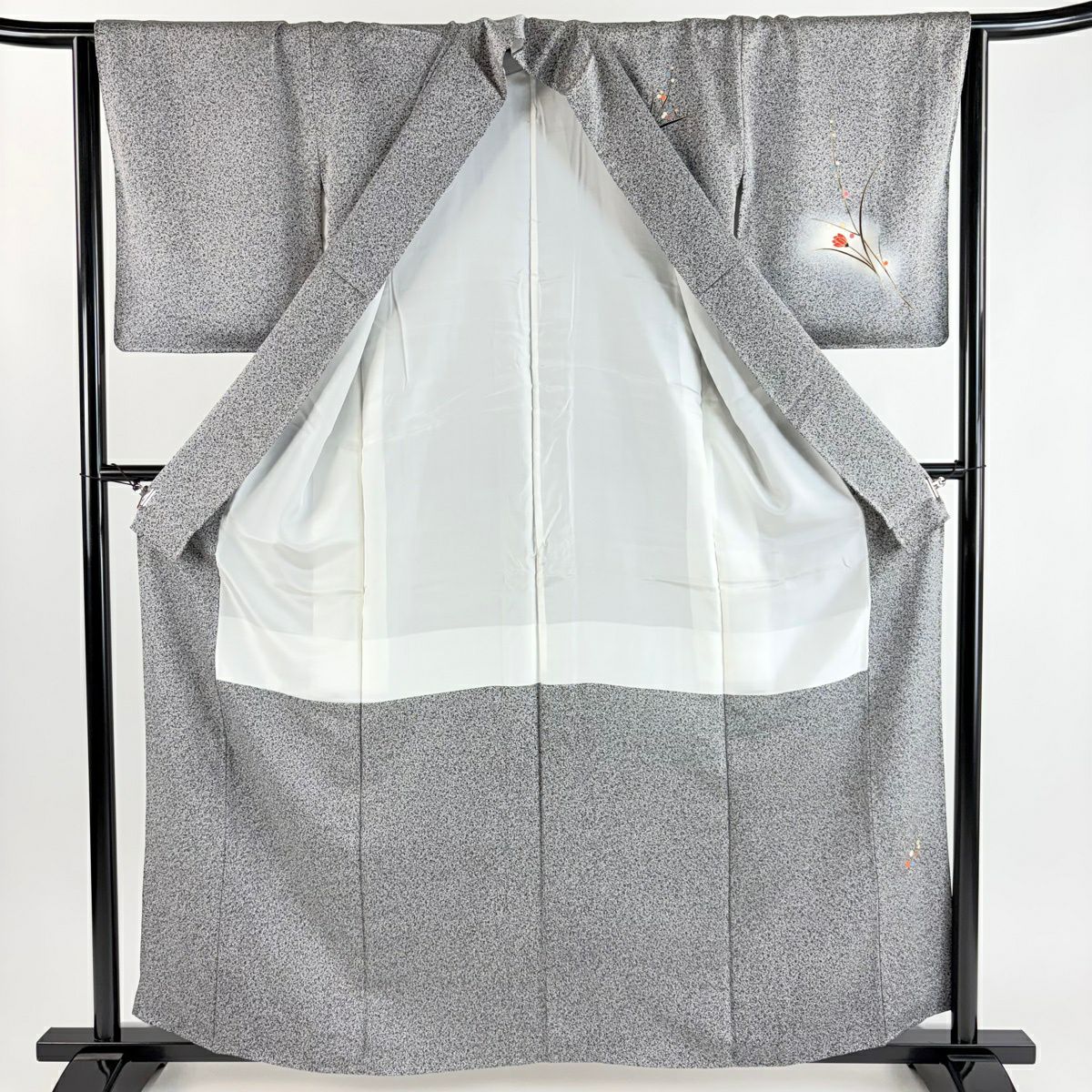 付下げ 身丈155.5cm 裄丈62cm S 袷 秋草 宝尽くし 刺繍 絞り 黒灰 正絹 秀品
