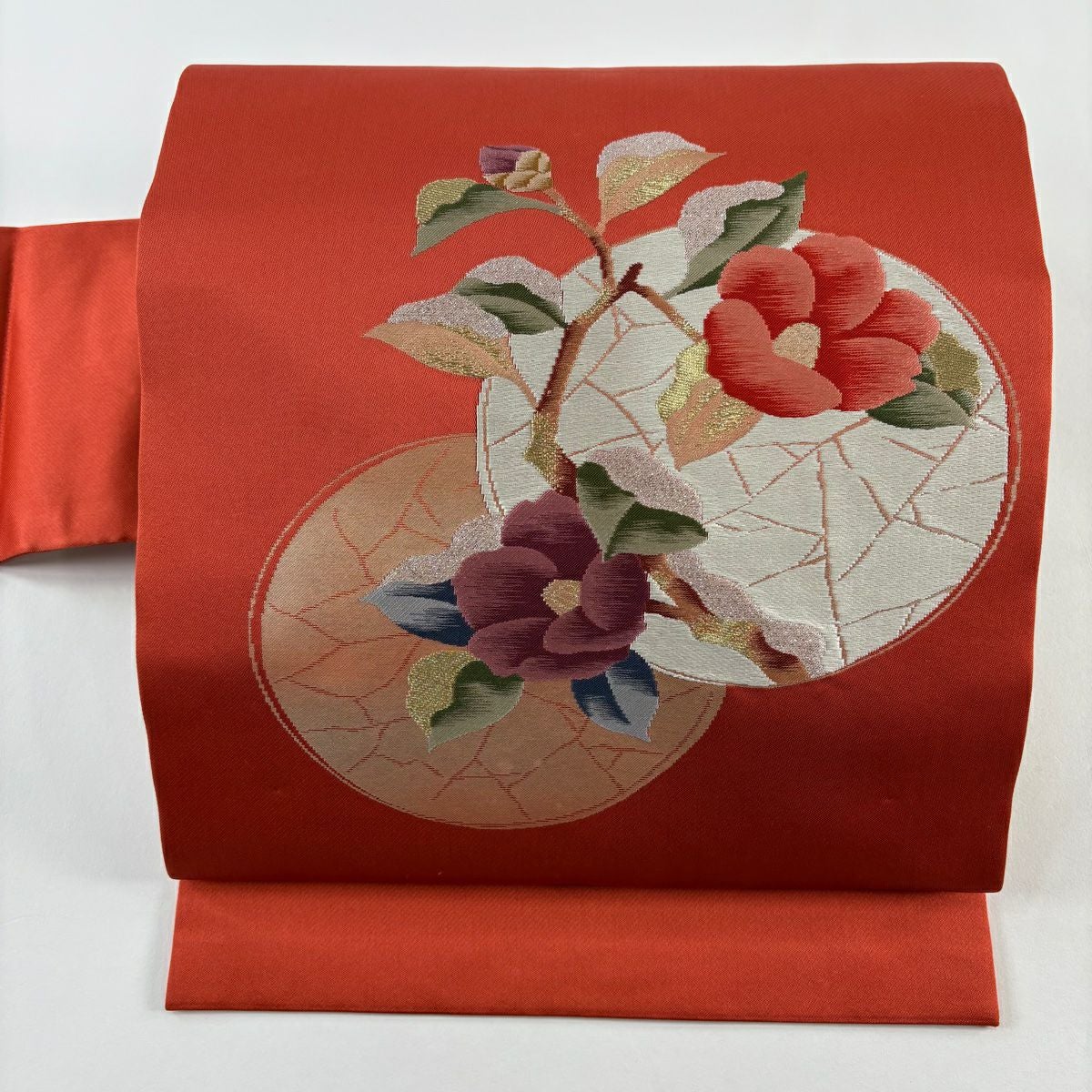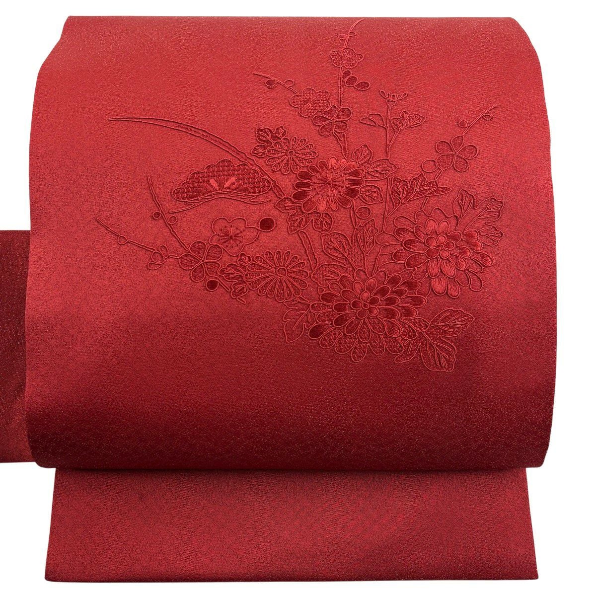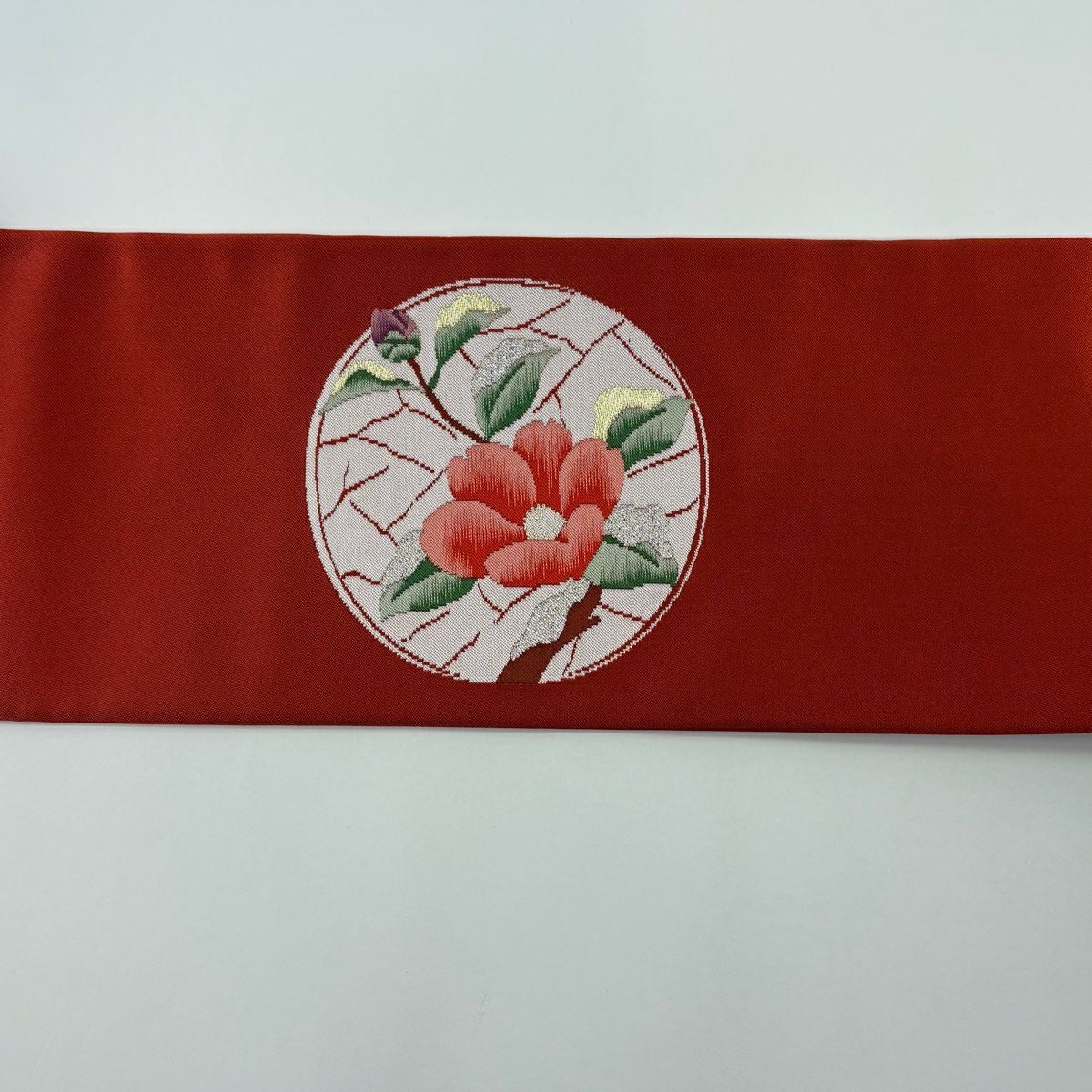 【美品】 名古屋帯 優品 菊 枝梅 刺繍 銀通し 赤 正絹
