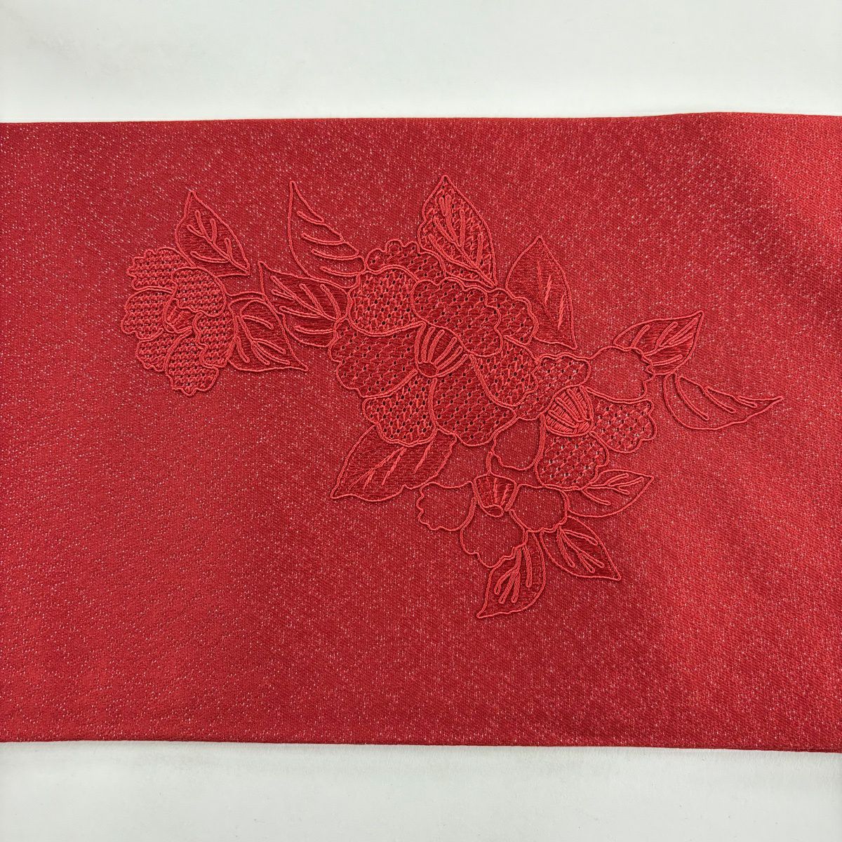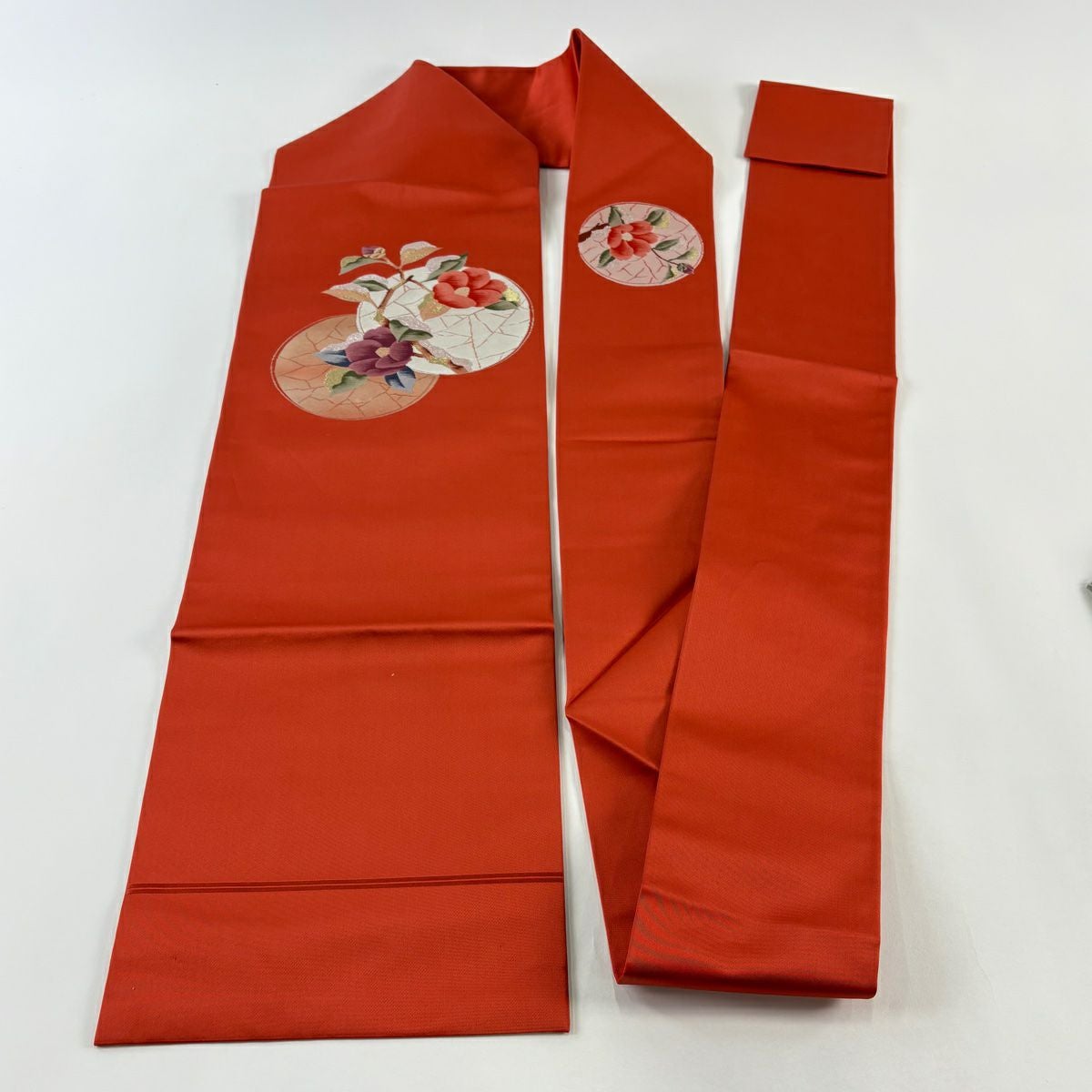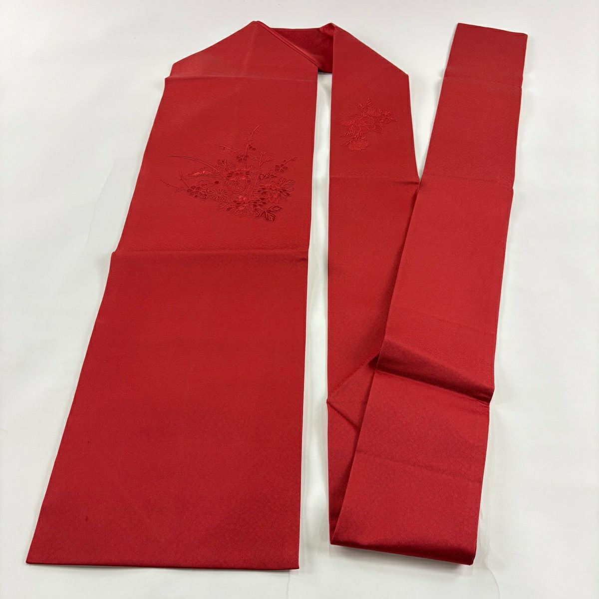 【美品】 名古屋帯 優品 菊 枝梅 刺繍 銀通し 赤 正絹