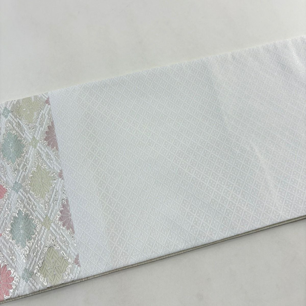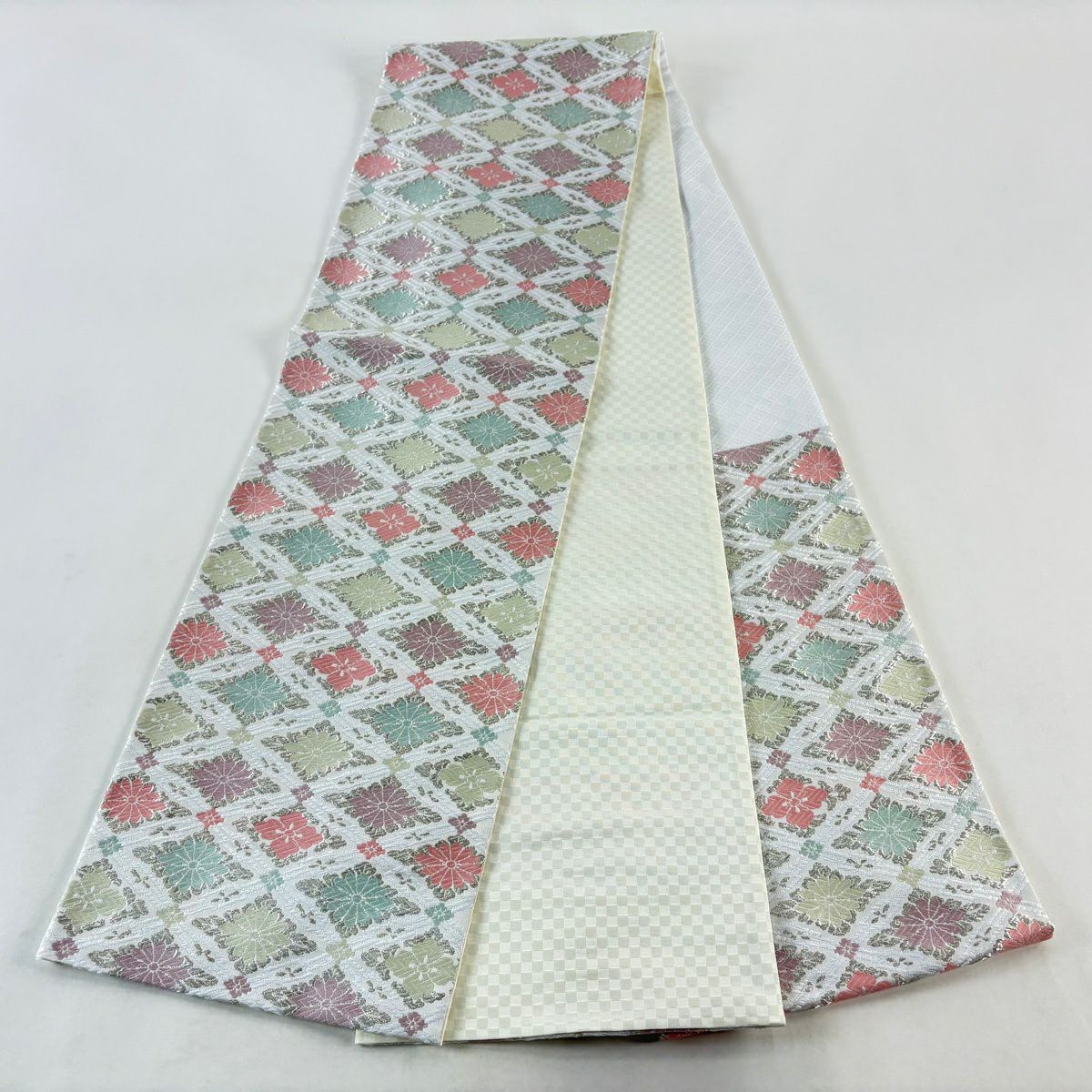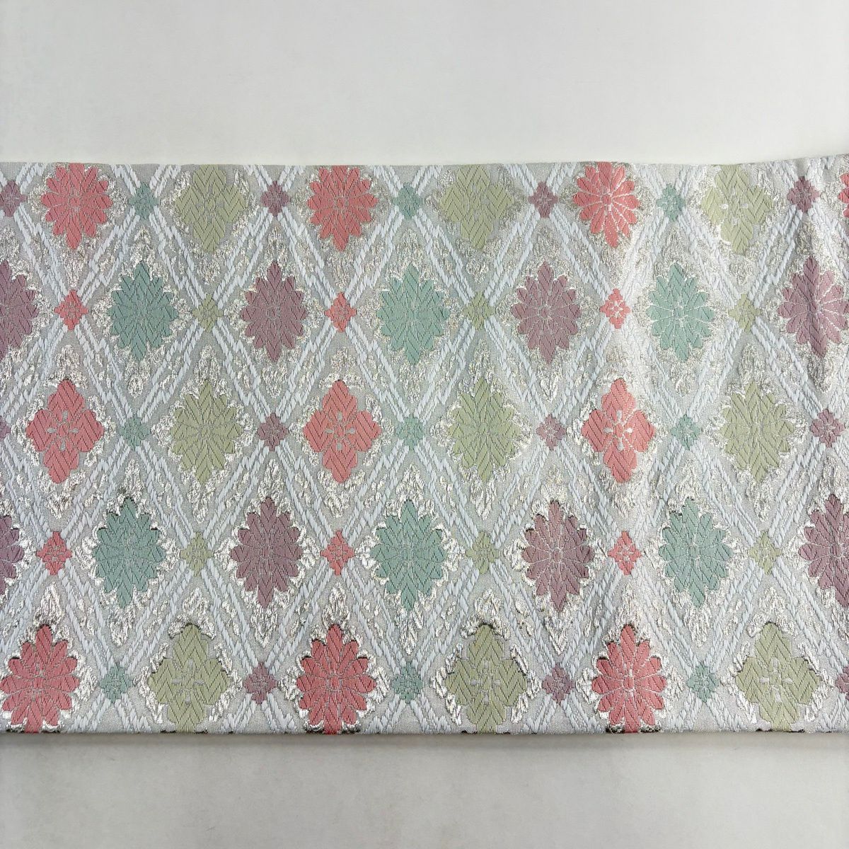 【美品】 袋帯 優品 花菱 菱天井 銀糸 灰白 六通 化繊