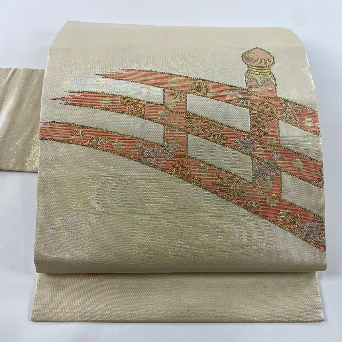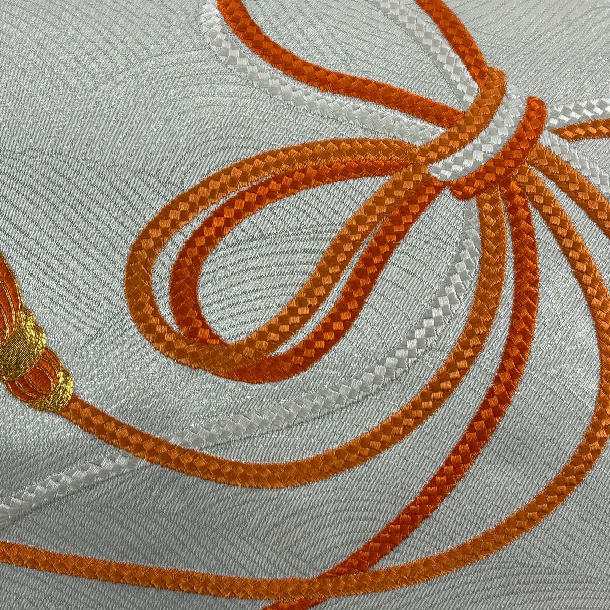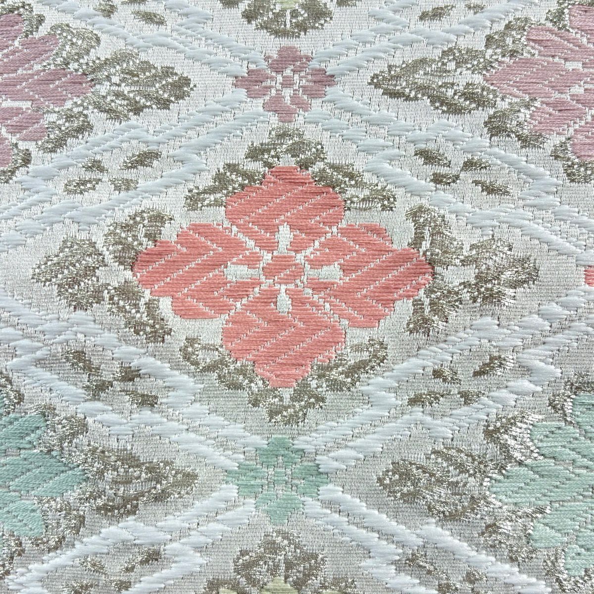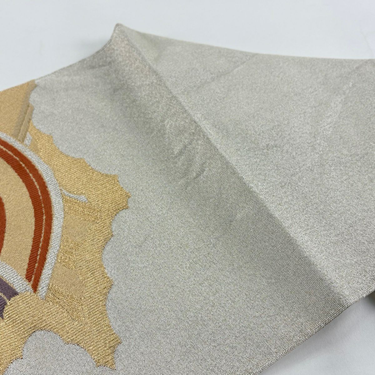 【美品】 袋帯 優品 花菱 菱天井 銀糸 灰白 六通 化繊