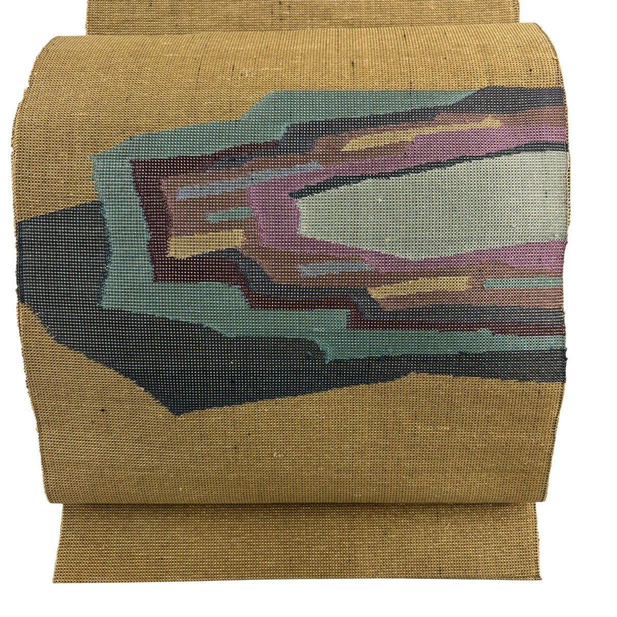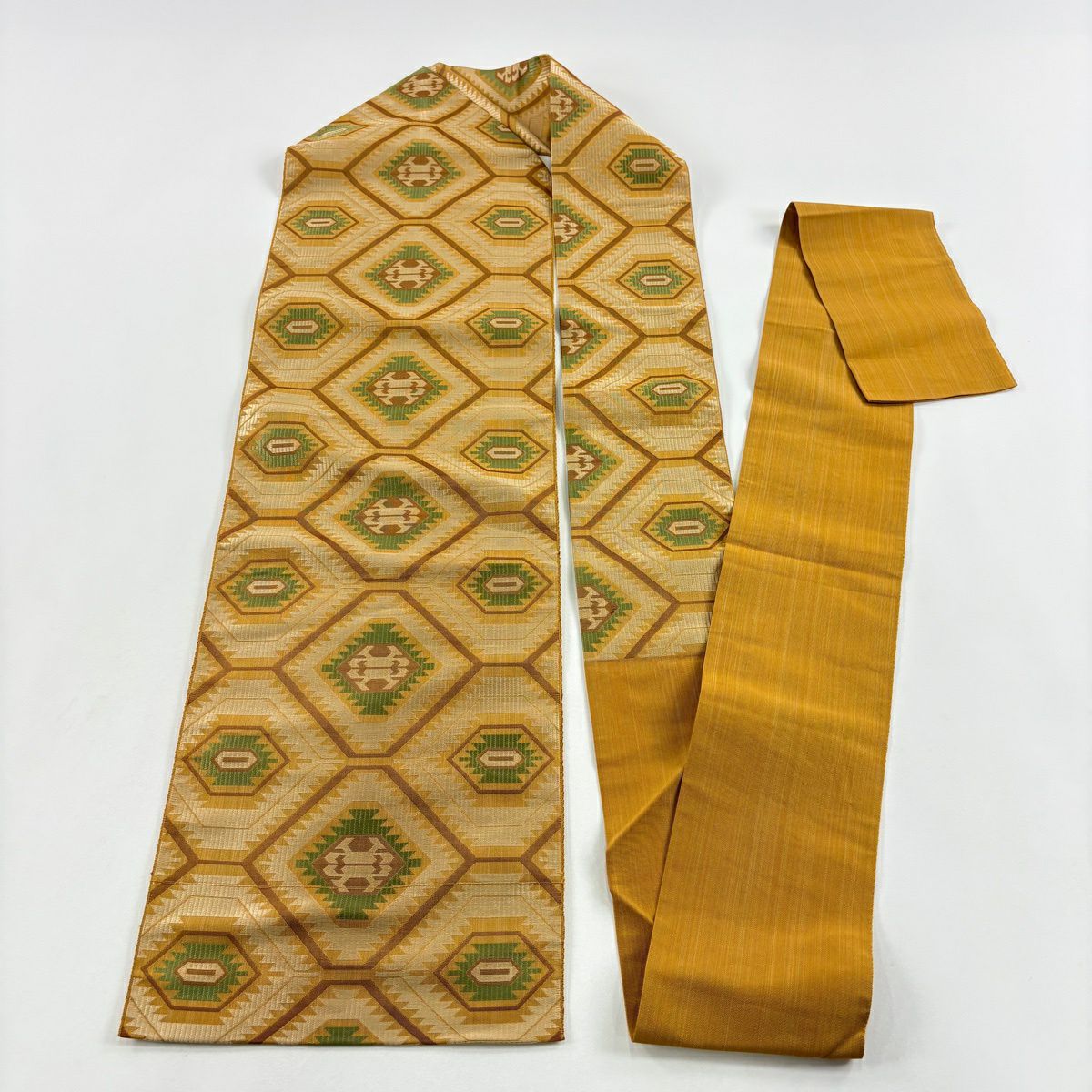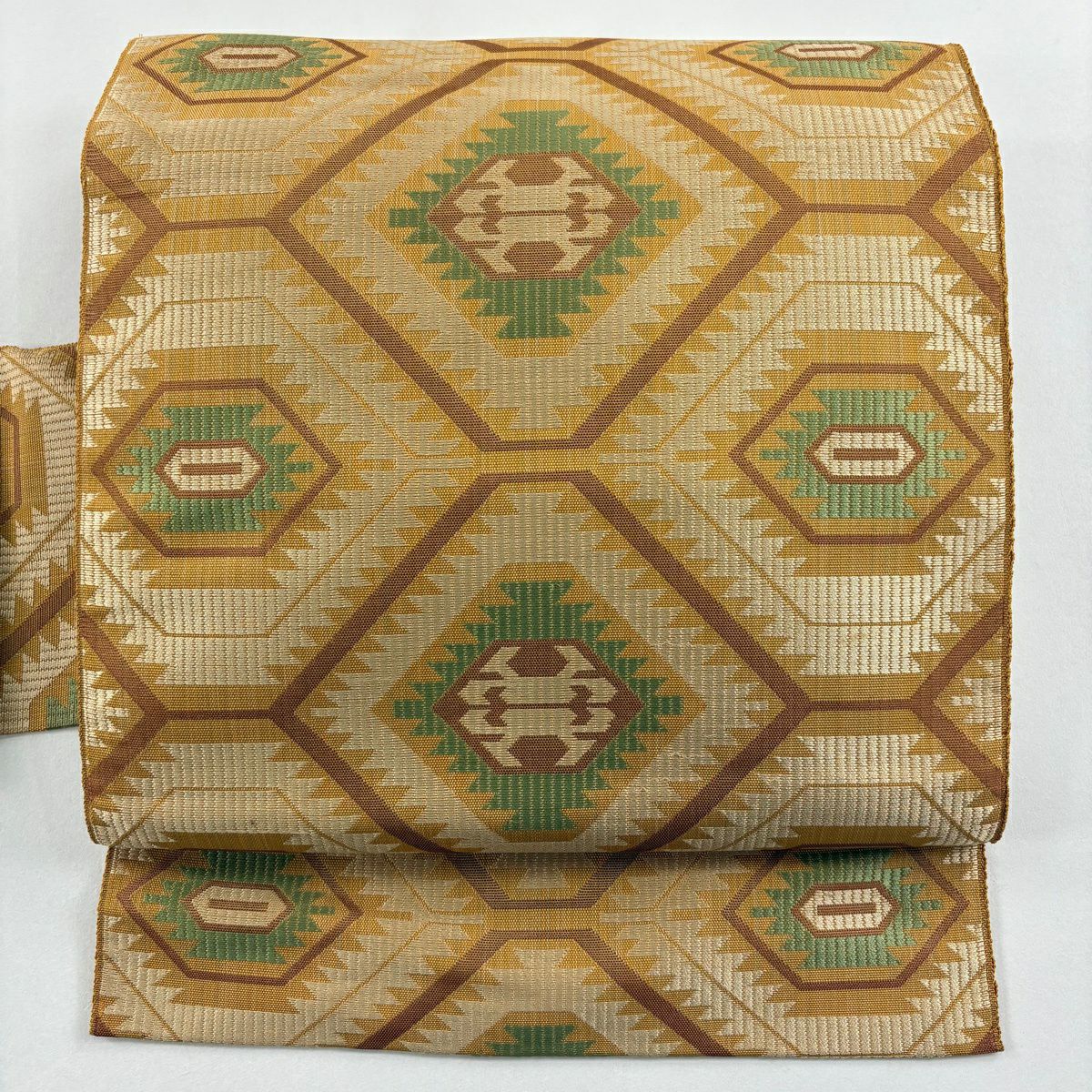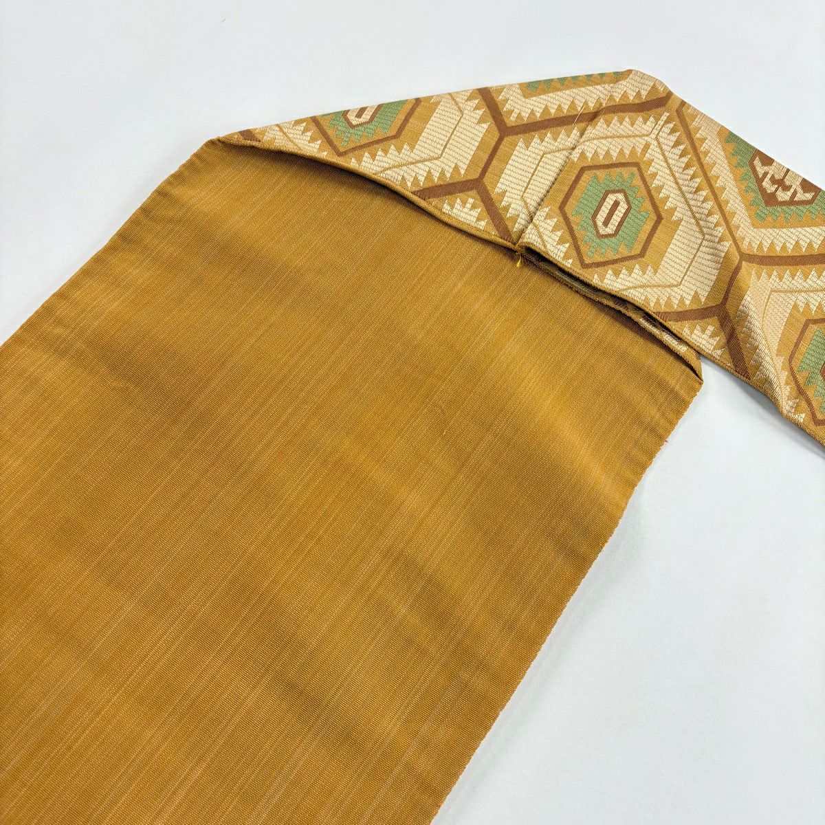 名古屋帯 優品 八寸名古屋帯 夏帯 幾何学 金通し 黄土色 正絹