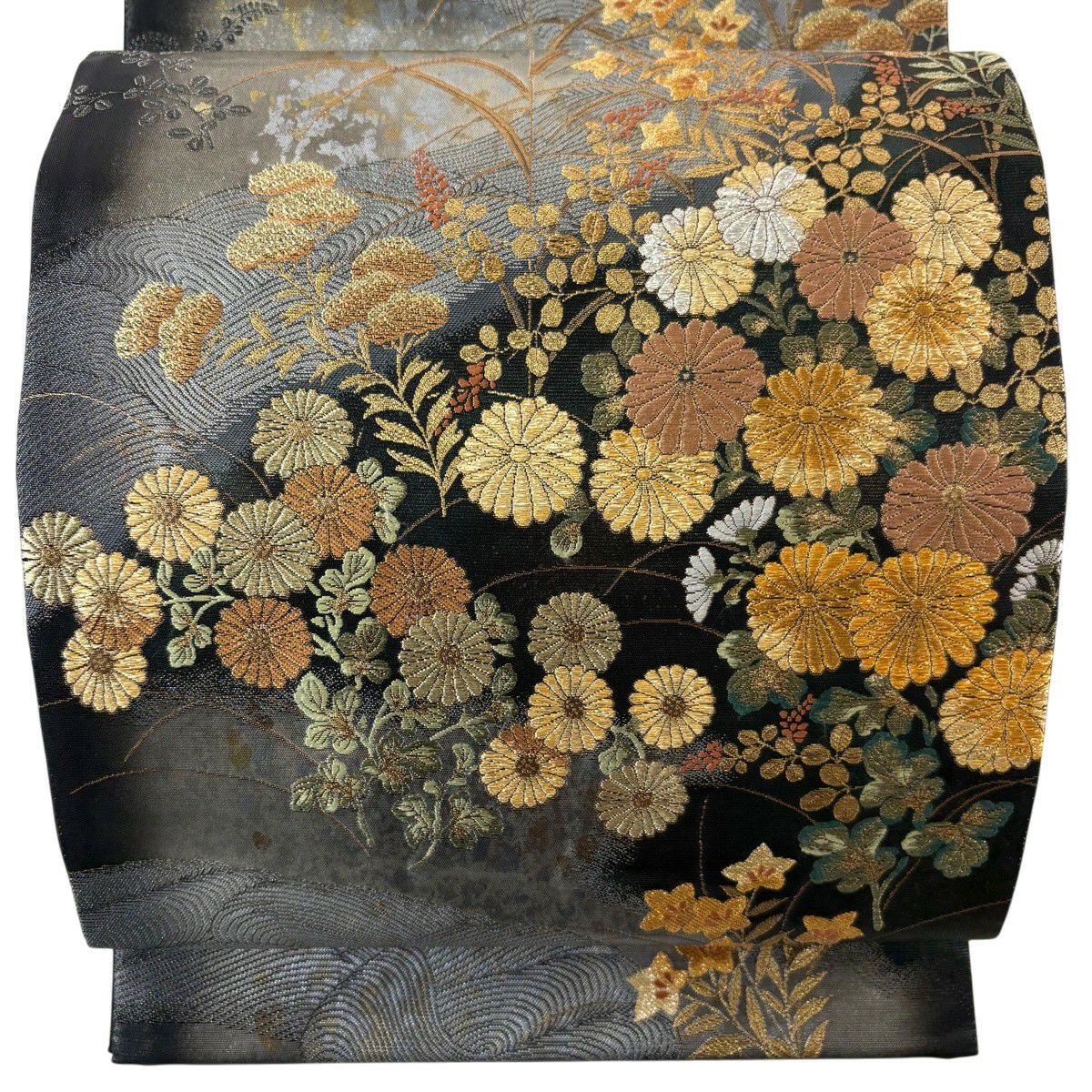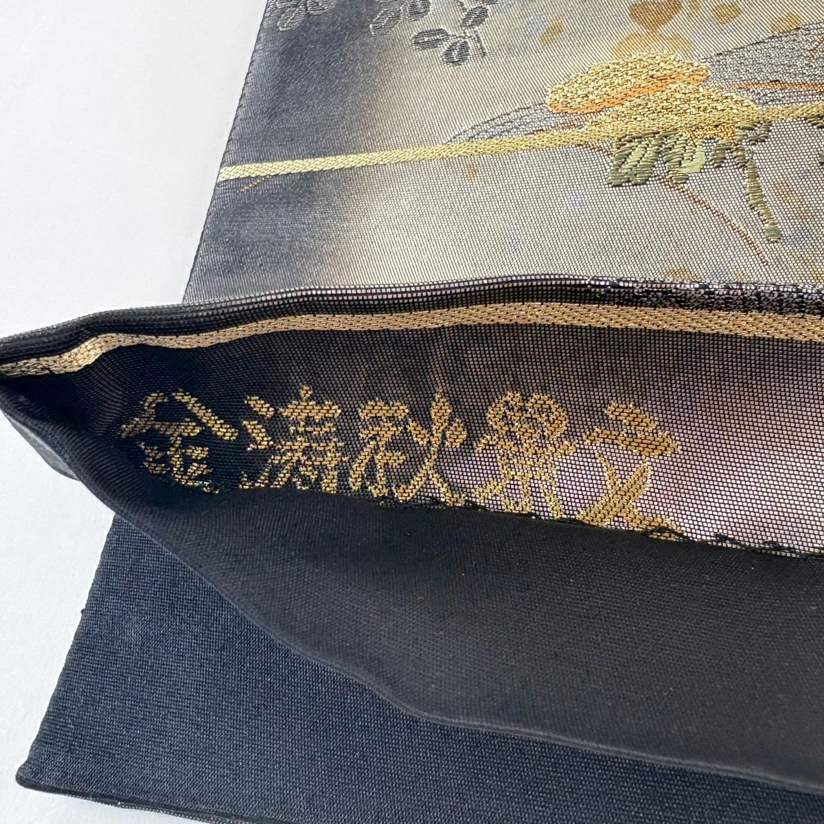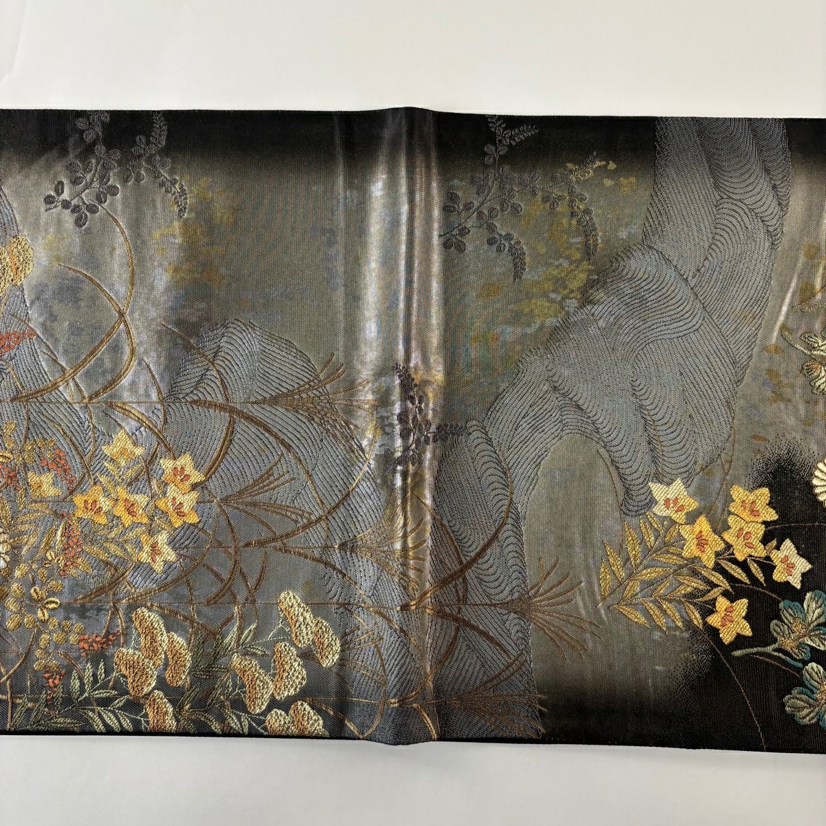 【美品】 袋帯 優品 秋草 波 金糸 箔 銀色 六通 正絹
