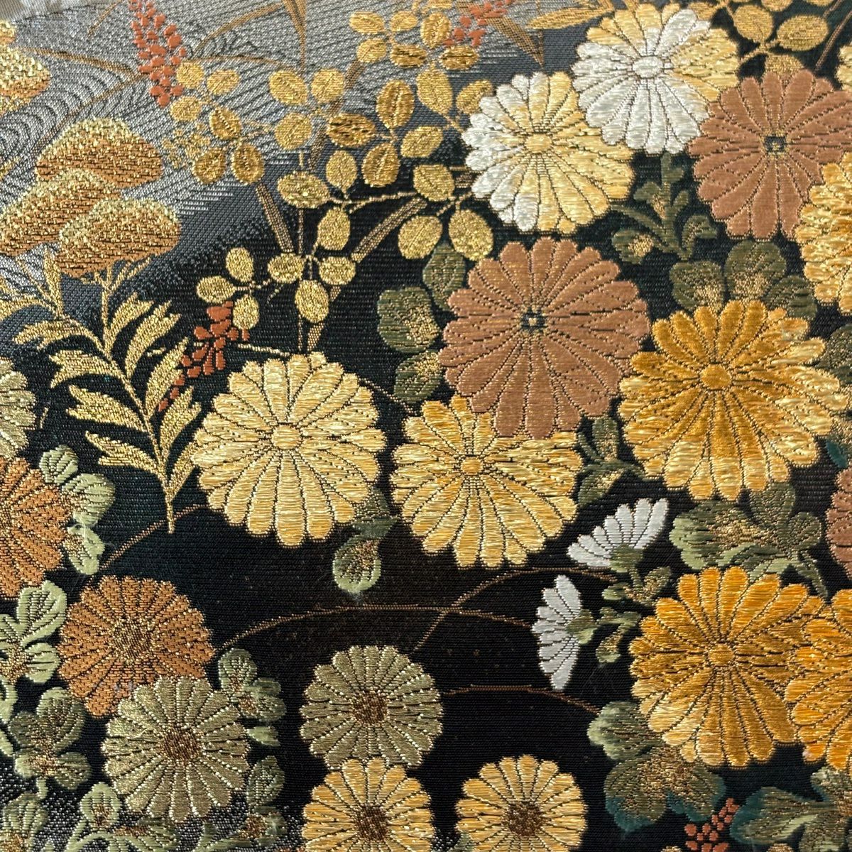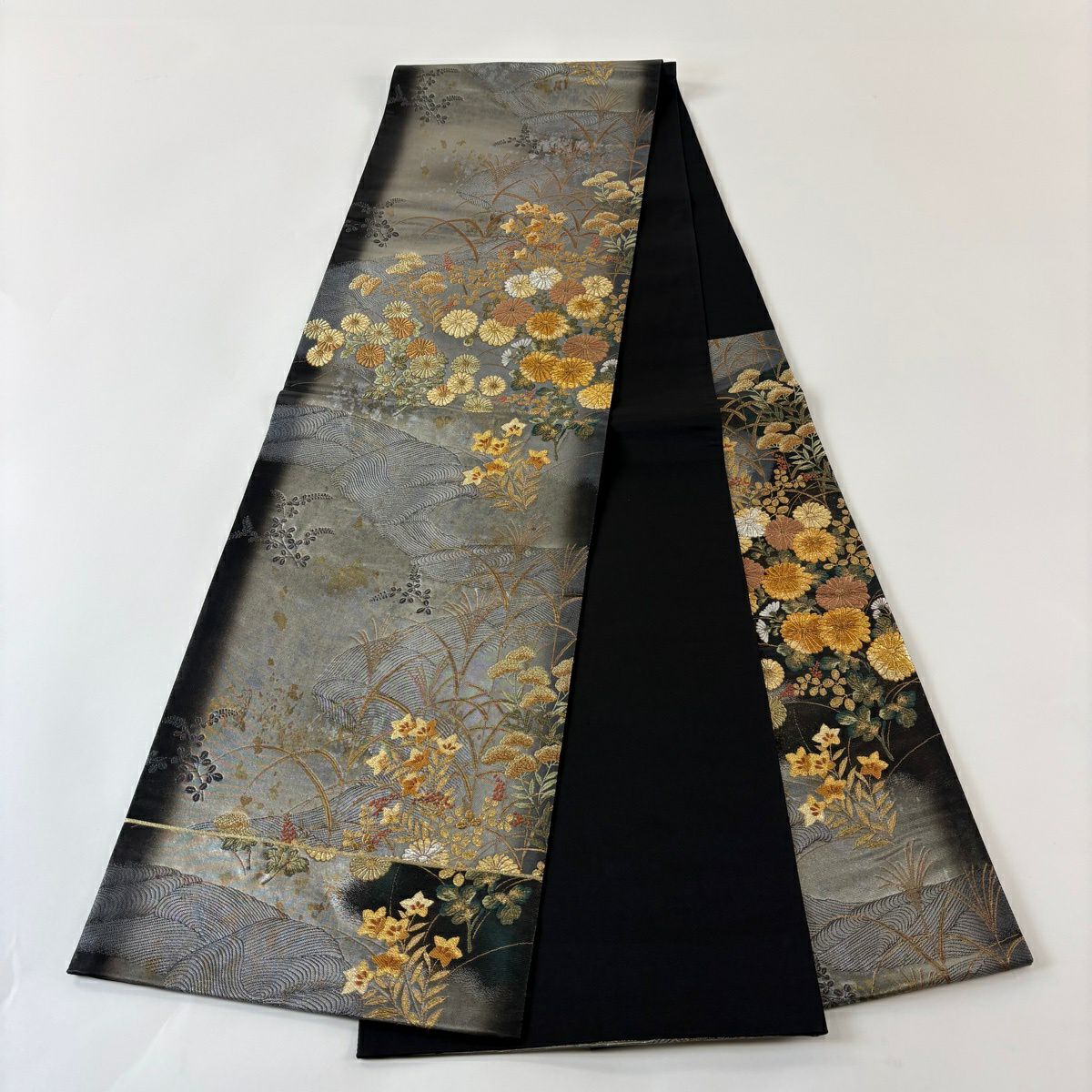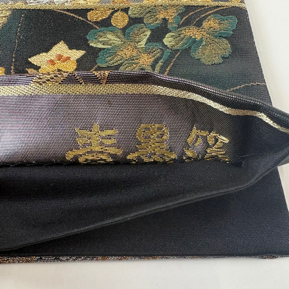 【美品】 袋帯 優品 秋草 波 金糸 箔 銀色 六通 正絹