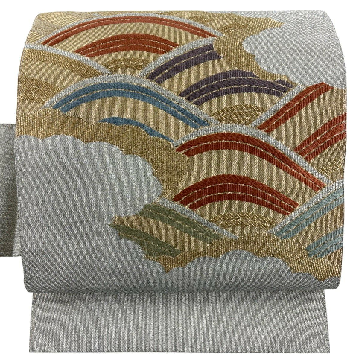 名古屋帯 優品 八寸名古屋帯 波 逆さ雲取り 金銀糸 銀色 正絹