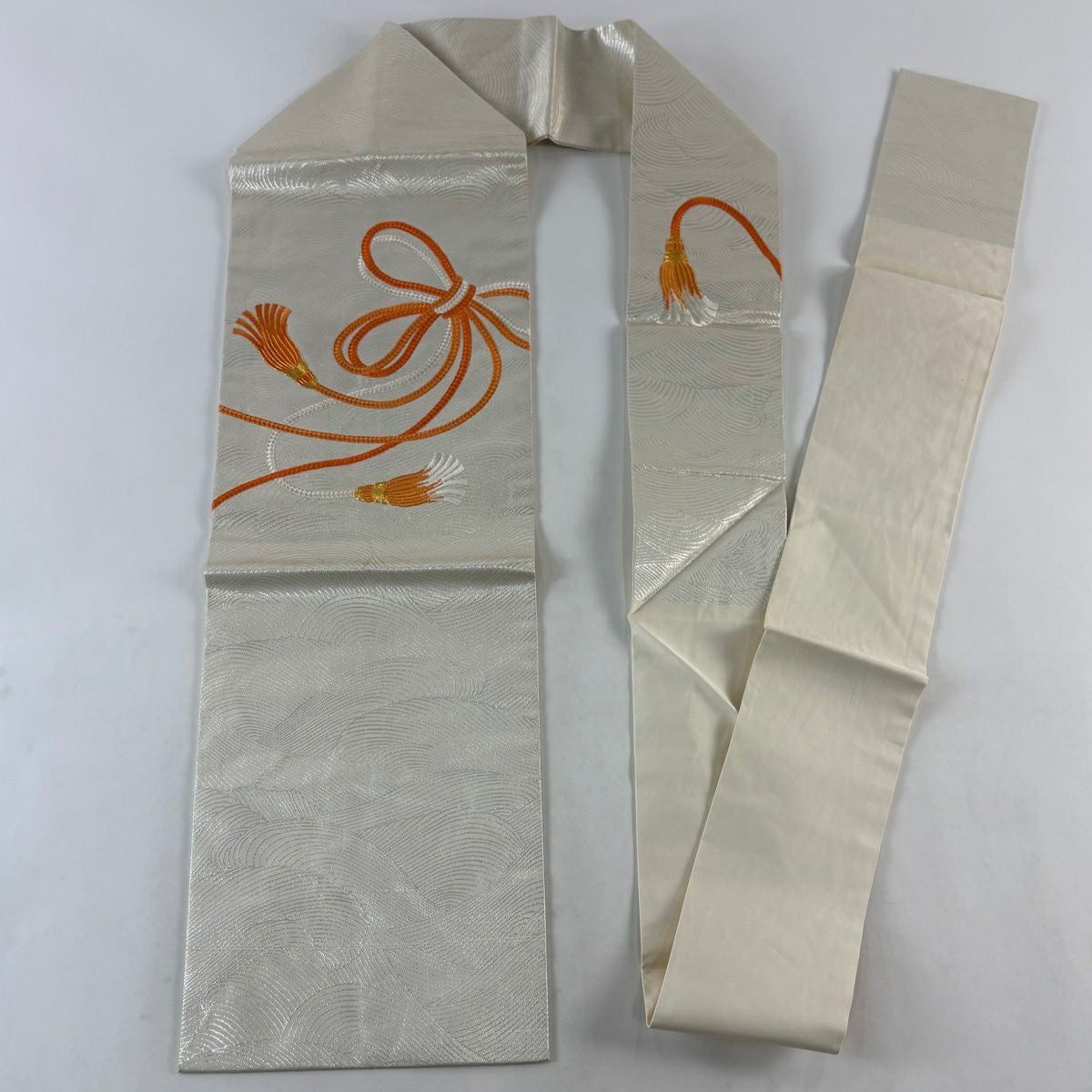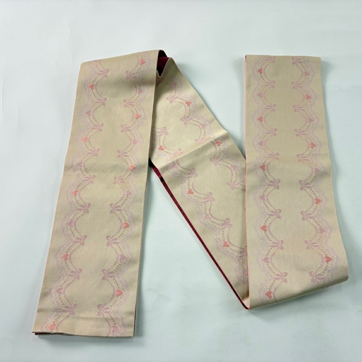 【美品】半幅帯 優品 リボン ハート ベージュ 化繊